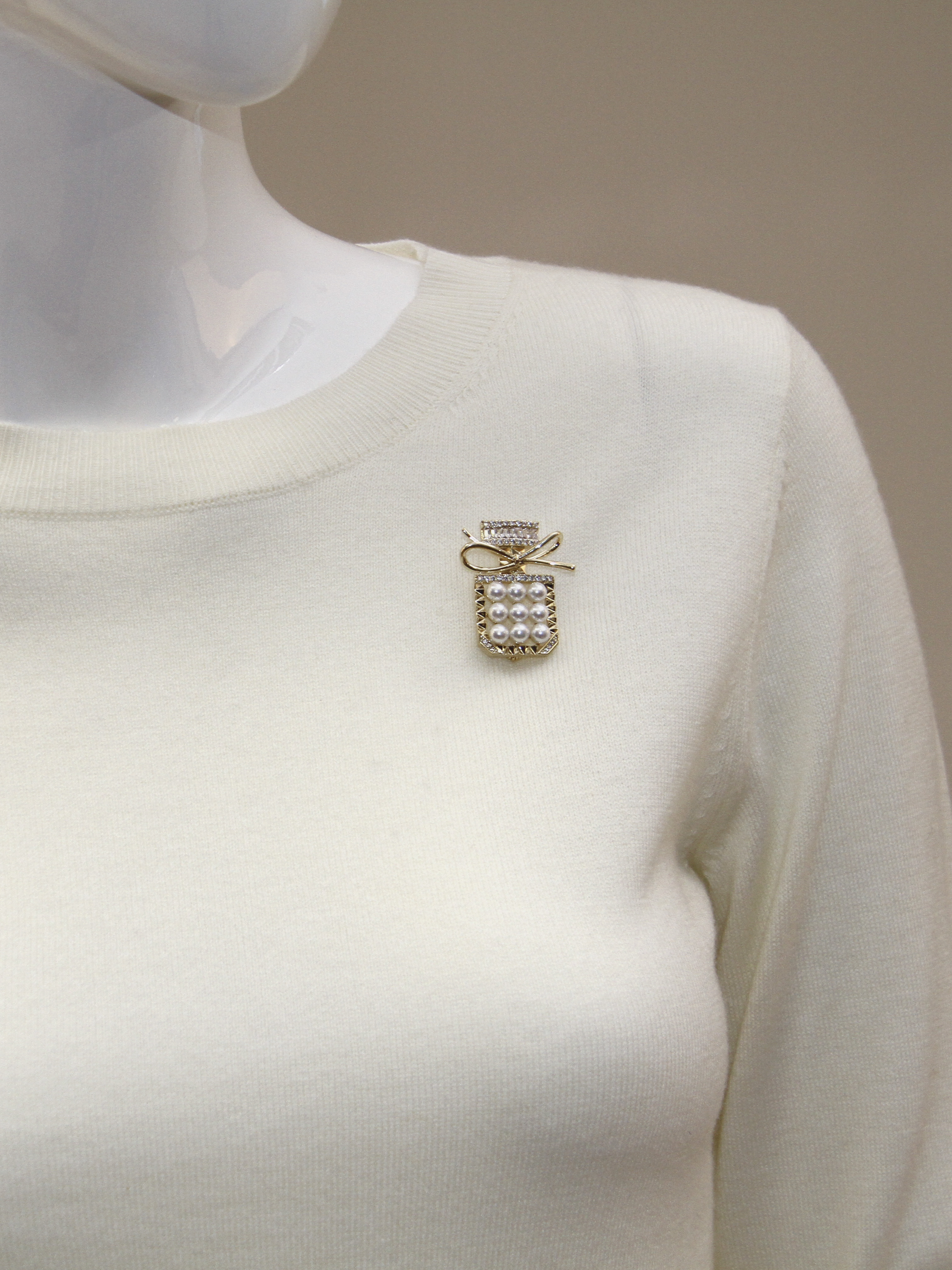 Оригинальная брошь в виде флакона с бантиком. Выполнена с использованием искуственного жемчуга.