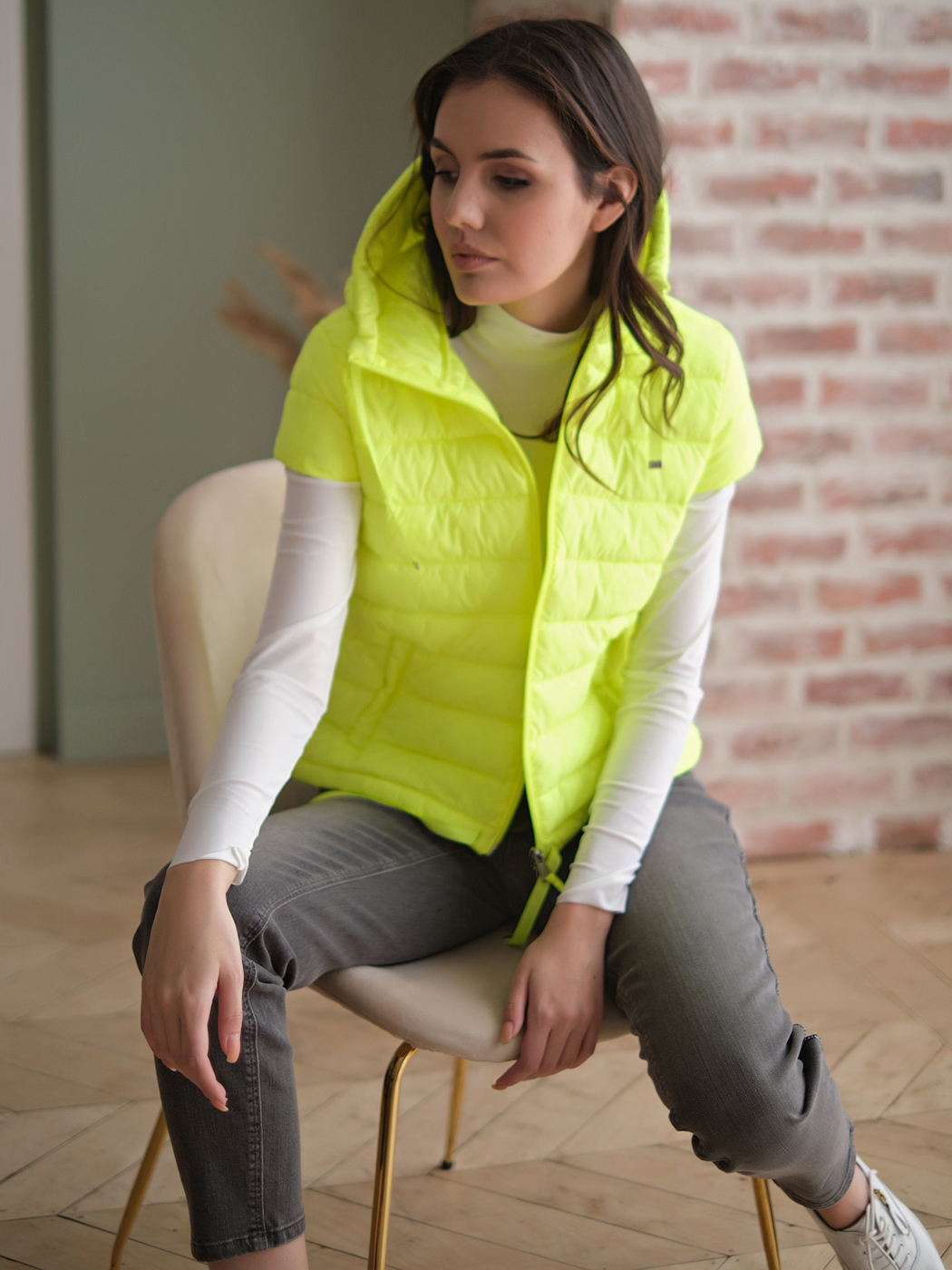 Неоновая стёганная куртка с коротким рукавом – яркий, привлекающий всеобщее внимание элемент образа. Застежка на молнию. Воротник стойка, глубокий капюшон. Кулиска по низу изделия.