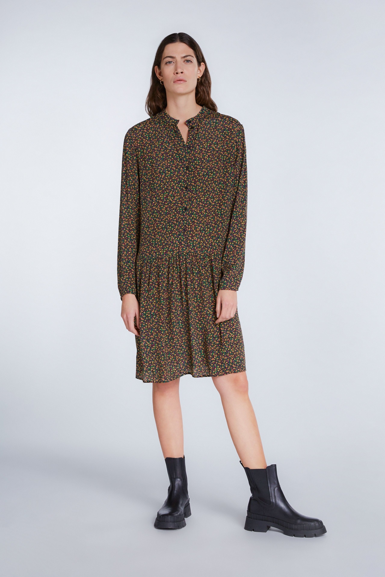 Романтичное платье свободного силуэта с заниженной талией. Длина до середины колена, втачной рукав полной дины, воротник стойка, планка с пуговицами. Можно составить великолепный трендовый образ с грубыми ботинками.