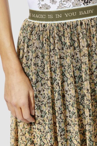 Двуслойная шифоновая юбка длины миди выполнена в цветочном узоре. Эластичный пояс обеспечивает комфортную посадку и удобство повседневного ношения.