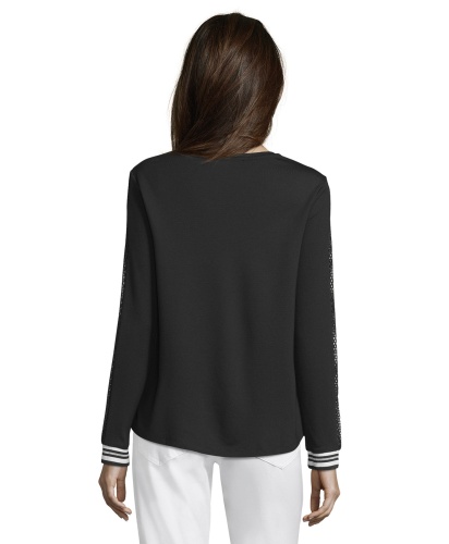 Джемпер прямого покроя. Круглый вырез горловины, удлиненная спинка, длинные рукава на манжетах. Материал из вискозной смеси обеспечивает комфорт. Блестящая отделка вдоль рукавов и декор стразами придают образу гламур. Отличный вариант верха для стильного повседневного образа!