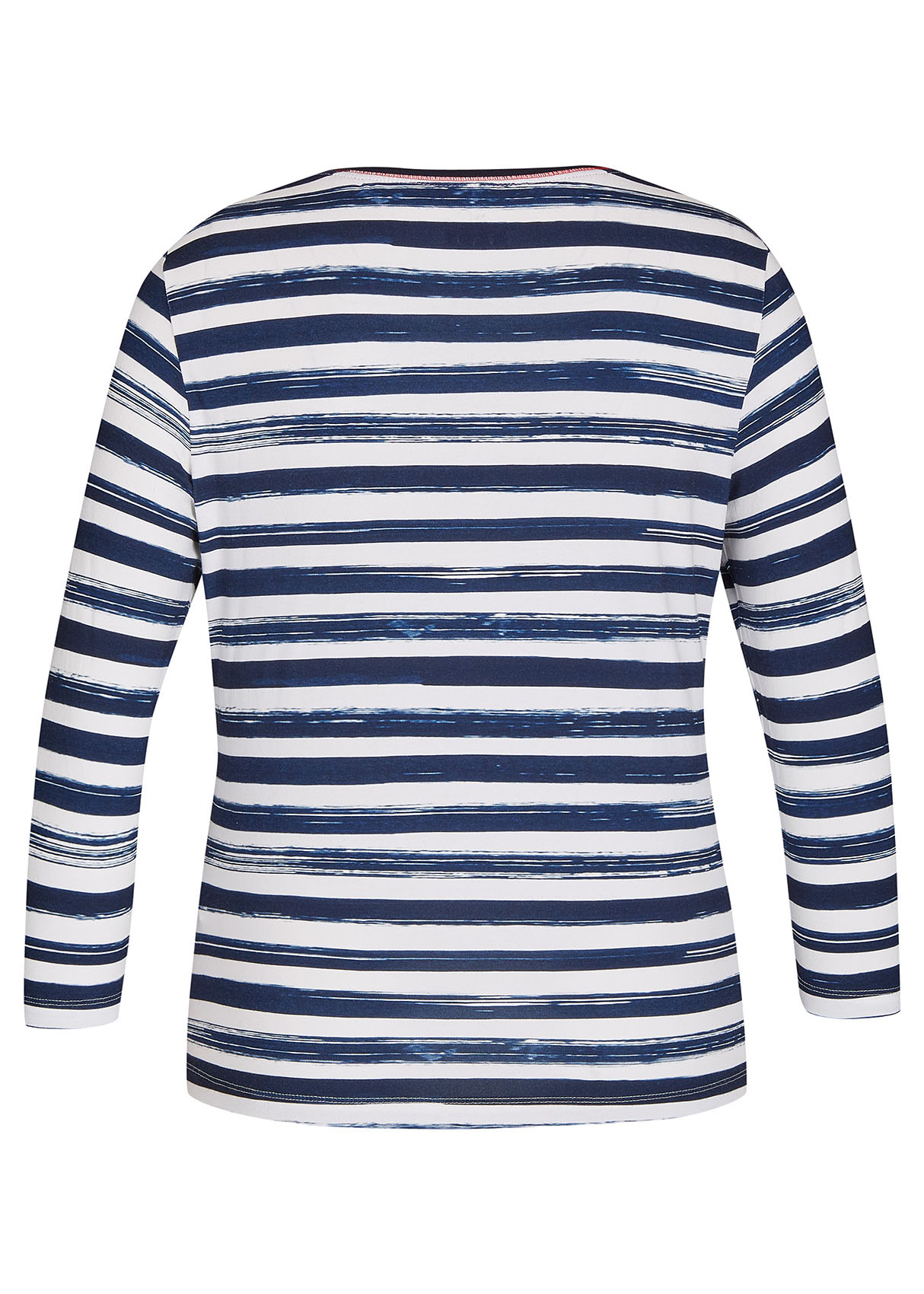 Полосатый дизайн и тропические цветы - то, что нужно для летнего образа! С брюками или с юбкой - эта футболка одинаково удачно выражает индивидуальность своей обладательницы. Приятный к телу материал из смеси вискозы и эластана гарантирует отличную посадку, а рукав 3/4 придает образу легкость и непринужденность. Длина изделия по спинке - 62 см.