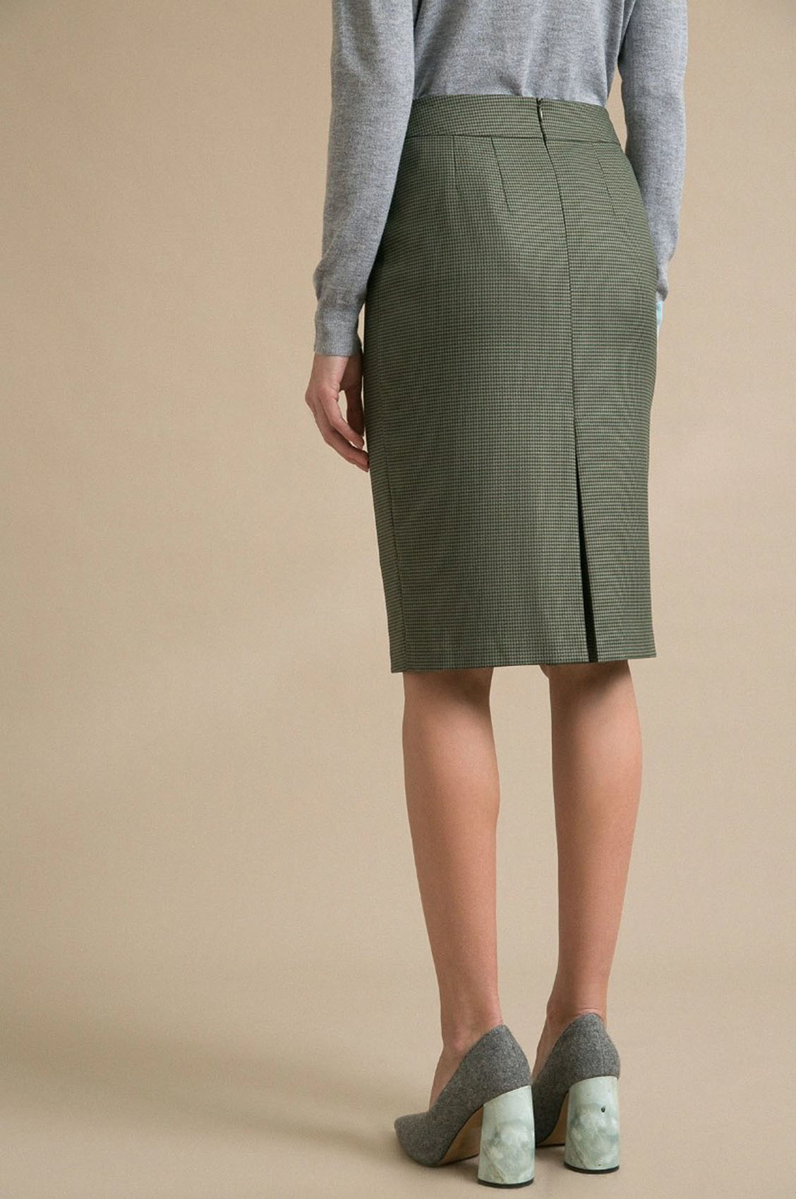 Юбка-карандаш с орнаментом "гусиная лапка". Модель имеет притачной пояс с металлическим элементом и потайную застежку-молнию сзади в среднем шве. Юбка декорирована сзади веерной складкой. Удачный выбор для создания повседневных и деловых образов.