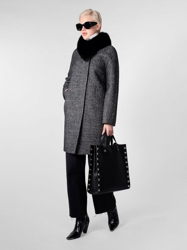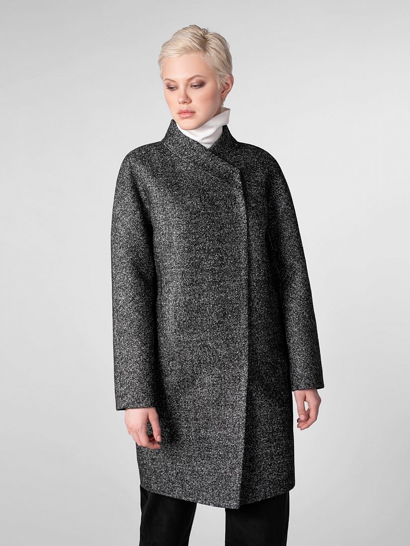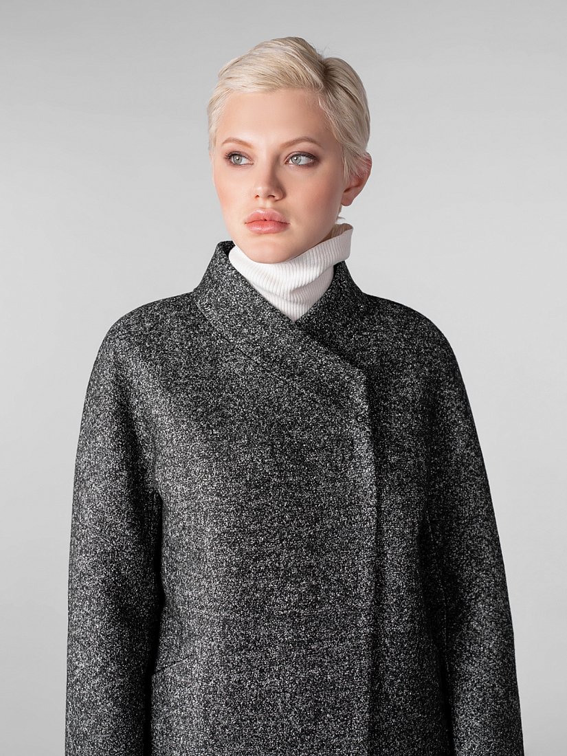 Пальто прямого силуэта "кокон" из чёрно-белой варёной шерсти. Длина выше колена. Рукава-кимоно, карманы-листочки, плосколежащий воротник-стойка, застёжка на пришивные кнопки. Съёмный меховой воротник из натурального песца. Пальто с ветрозащитной мембраной Raft Pro. Утеплитель DuPont Sorona из биопуха.