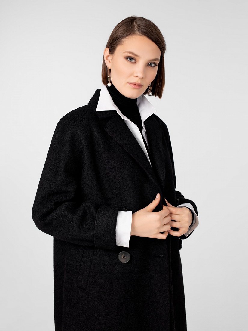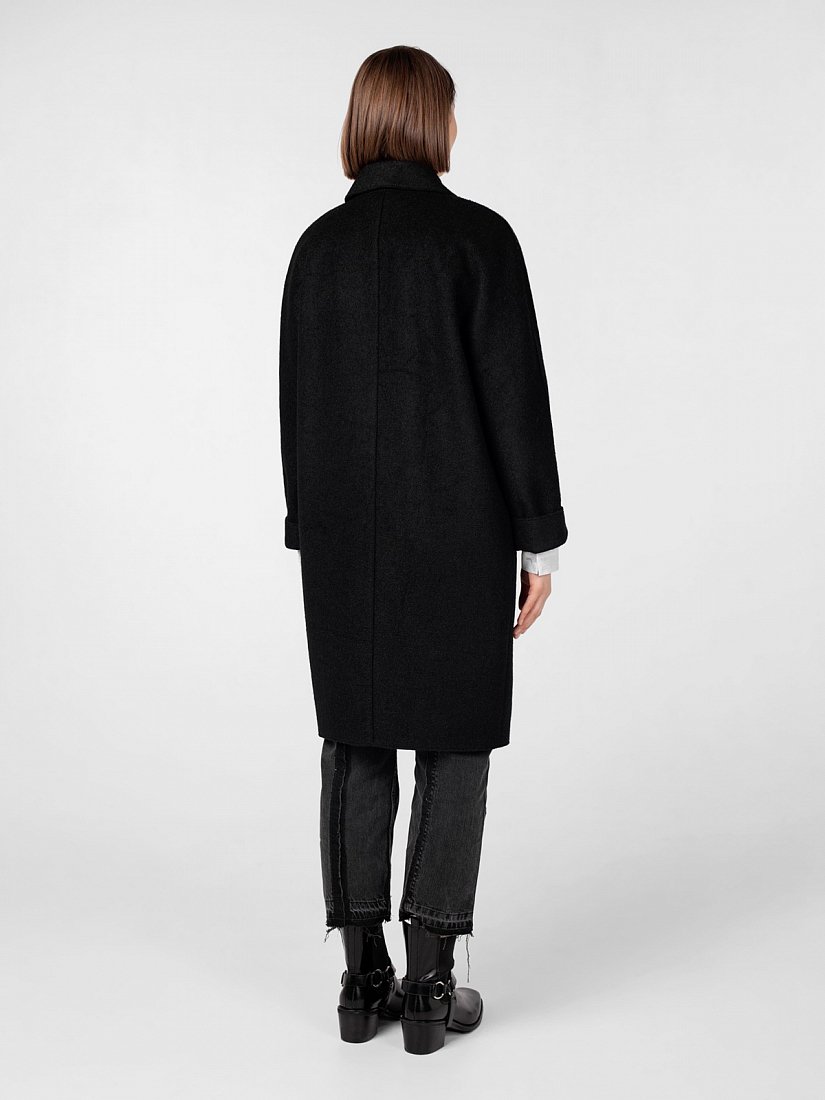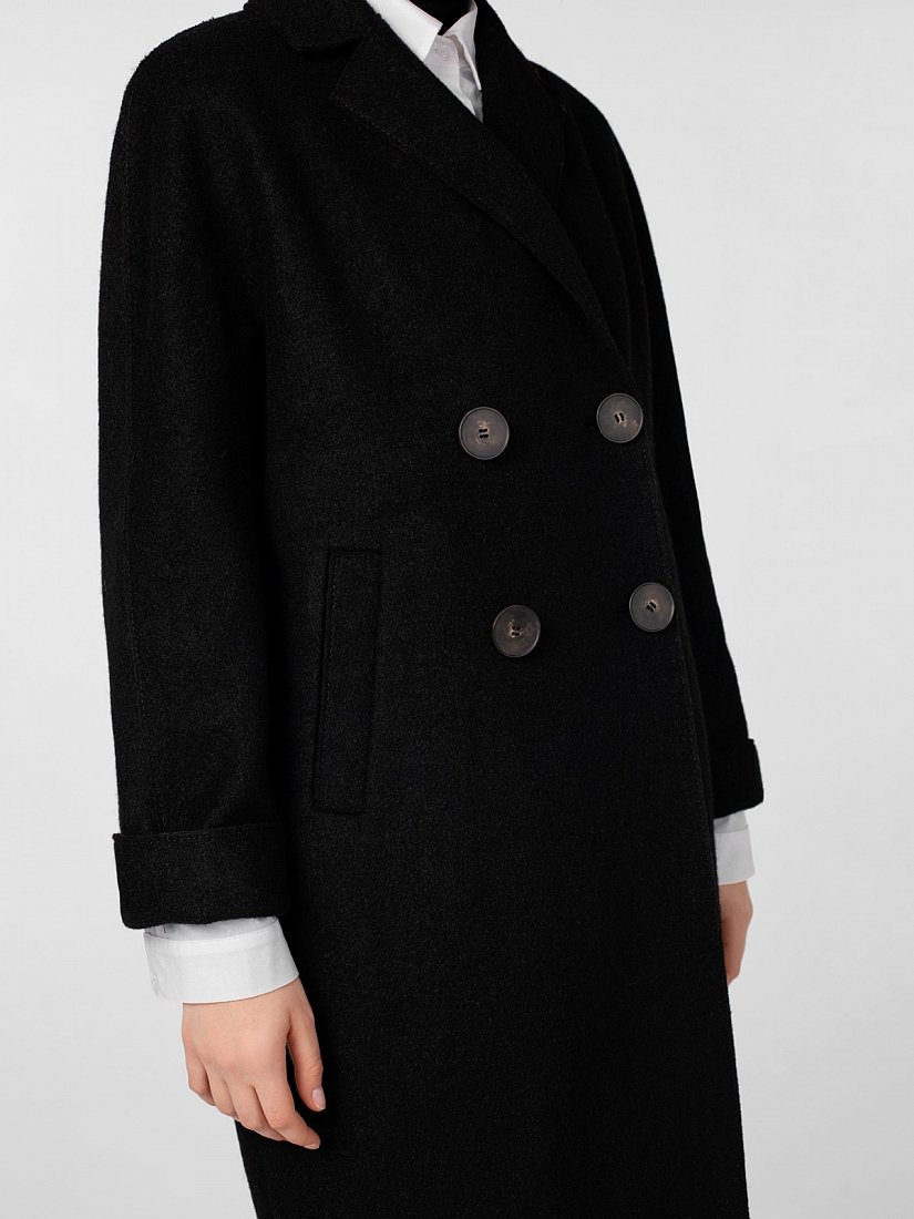Двубортное пальто силуэта "кокон" длиной до колена. Рукава-кимоно с отворотами по низу, застёжка на крупные роговые пуговицы, английский воротник, карманы-листочки. Выполнено с открытыми срезами и декорировано отделочными строчками. Произведено с ветрозащитной мембраной Raft Pro. Изготовлено из варёной шерсти чёрного цвета.