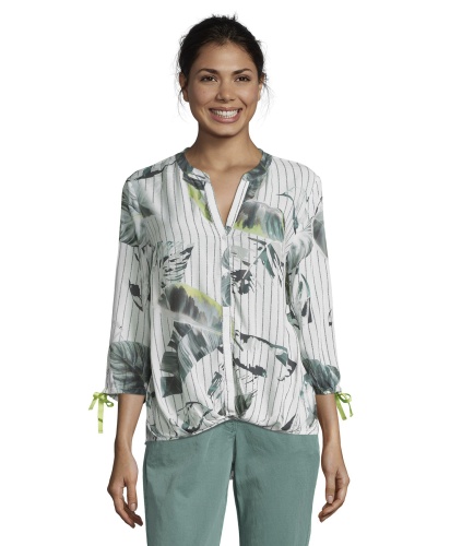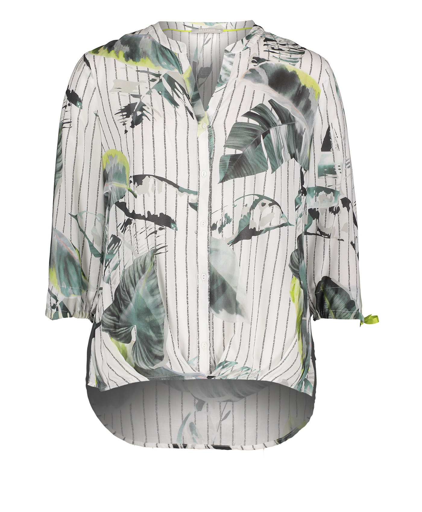 Блуза является необходимым элементом женского гардероба. Удлиненная спинка изделия, небольшие разрезы по бокам, рукава 3/4 на завязках. Принт с мелкой надписью и трендовым тропическим мотивом. Хлопковый материал приятен к телу и обеспечивает комфорт. Блуза стильно смотрится с однотонными брюками и любой обувью.