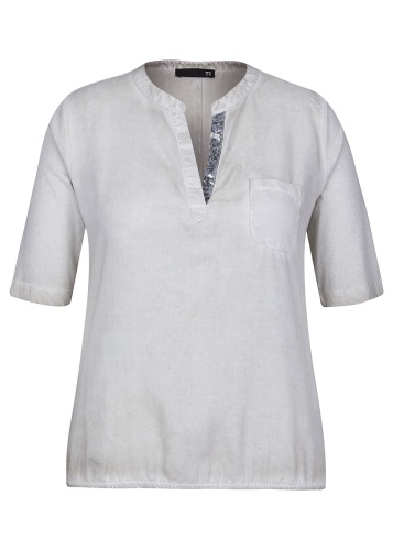 Прямой покрой, V-образный вырез, рукав 1/2 и кармашек на груди - вот рецепт лаконичного дизайна. Но блуза стального оттенка не выглядит скучной благодаря пайеткам на планке! Материал из смеси хлопка и модала комфортный и приятный к телу. В зависимости от варианта низа с данной блузой можно создать как более классический, так и демократичный образ.