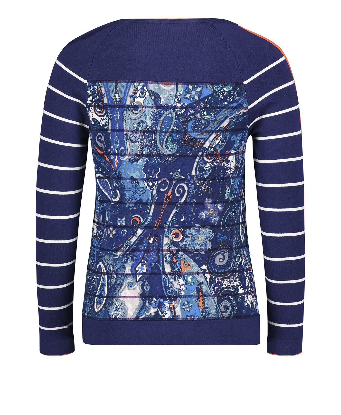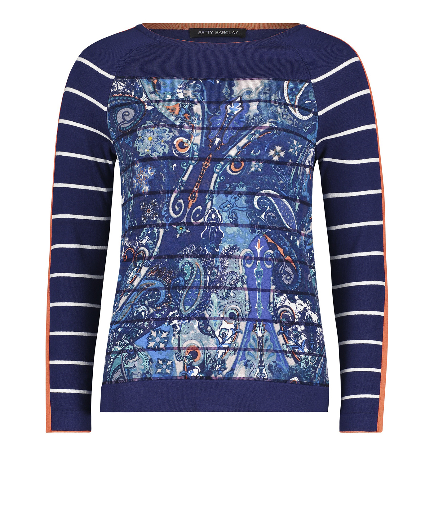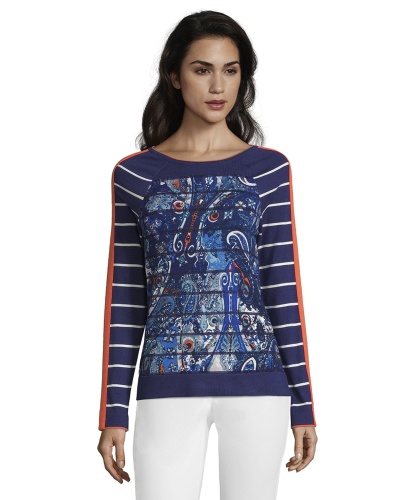 Смелое сочетание полоски и этнического принта обращает на себя внимание! Джемпер слегка приталенного силуэта с горловиной-лодочкой. Длинные рукава реглан. Материал из вискозной смеси приятен к телу и обеспечивает комфорт. Этот джемпер гарантирует современный образ в сочетании с любым однотонным вариантом низа.