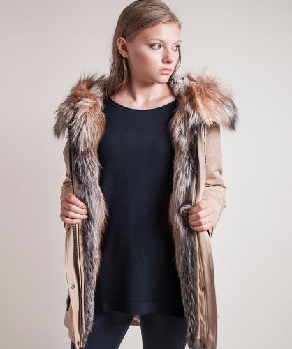 Теплая пихора на подкладке из натурального меха кролика. Плотная ткань верха. Прямой покрой, кулиска на талии. Удлиненная спинка, замки-молнии по бокам. Накладные карманы на клапанах. Рукава декорированы замками и патой на кнопке. Оторочка капюшона из натурального лисьего меха.