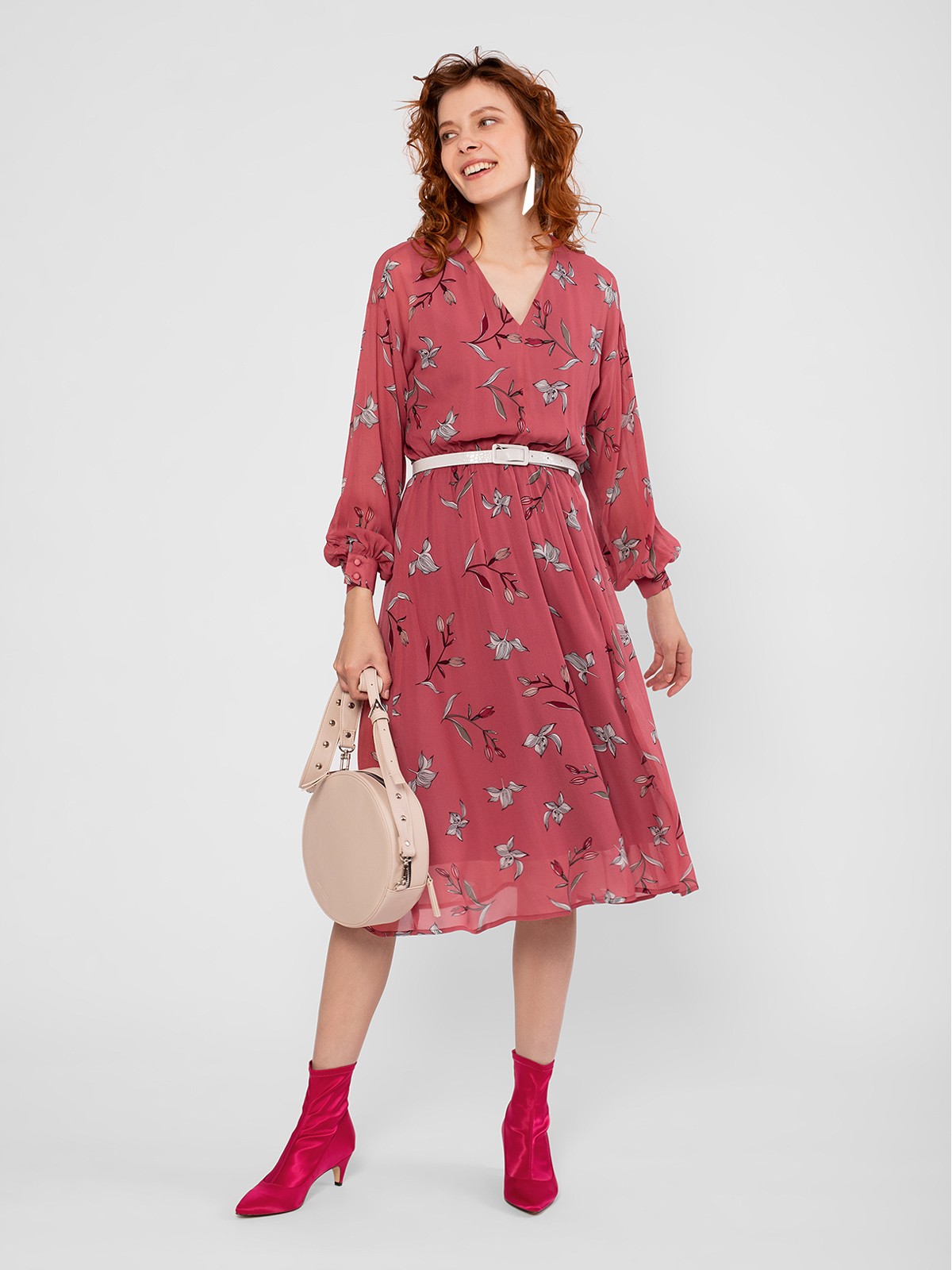 Платье из вискозы полуприлегающего силуэта с v-образным вырезом, спущенным плечом и обьемным рукавом на манжете. На талии резинка. В комплект входит узкий съемный ремень из экокожи с металлической пряжкой.