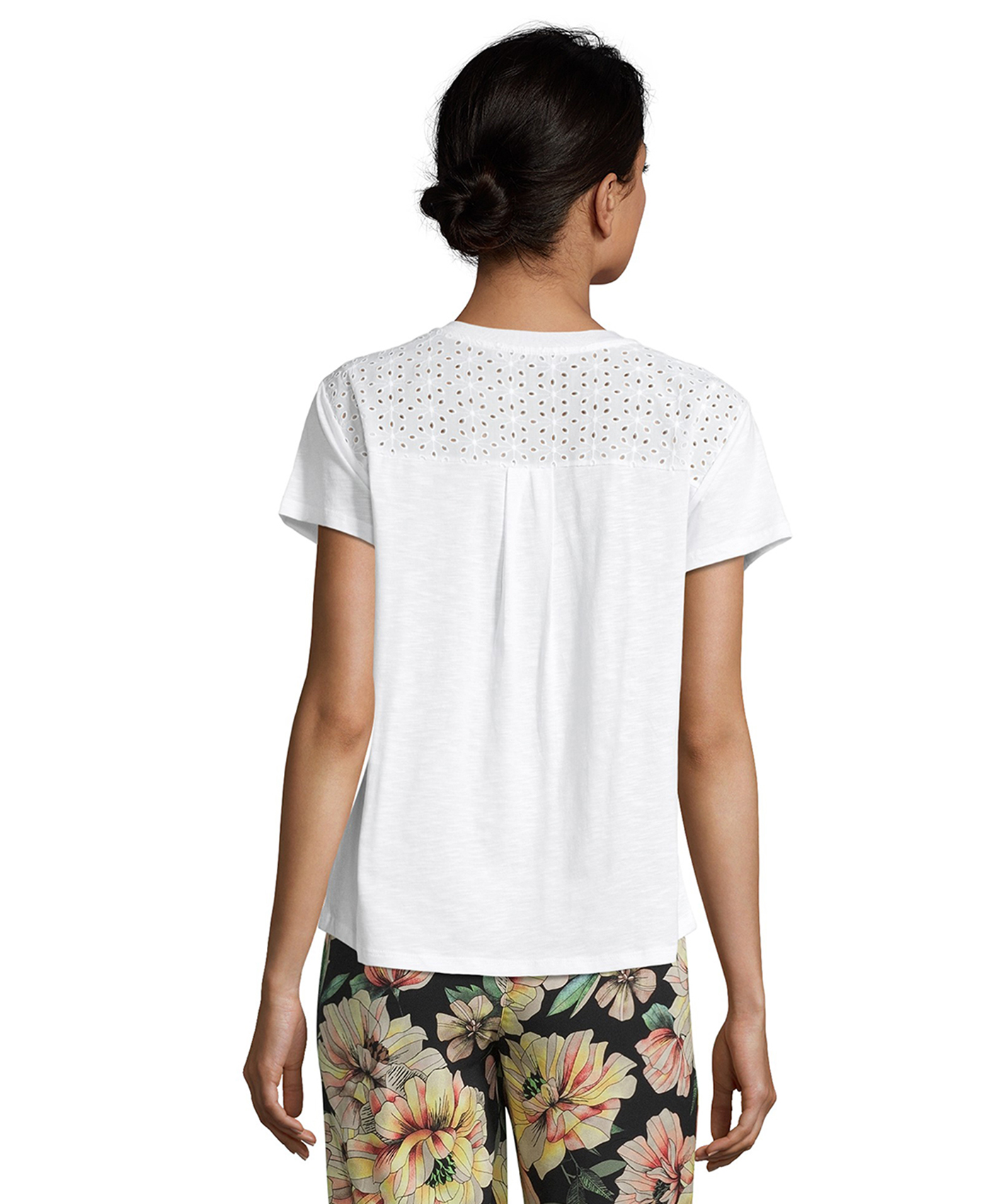 Эта стильная футболка создает романтический образ. Прямой покрой, V-образный вырез, короткие рукава, удлиненная спинка изделия. Ажурные вставки на кокетке переда и спинки изделия подчеркивают женственность обладательницы футболки. Материал из смеси хлопка и модала приятен к телу и обеспечивает комфорт. Эта футболка отлично сочетается как с брюками, так и с юбкой.