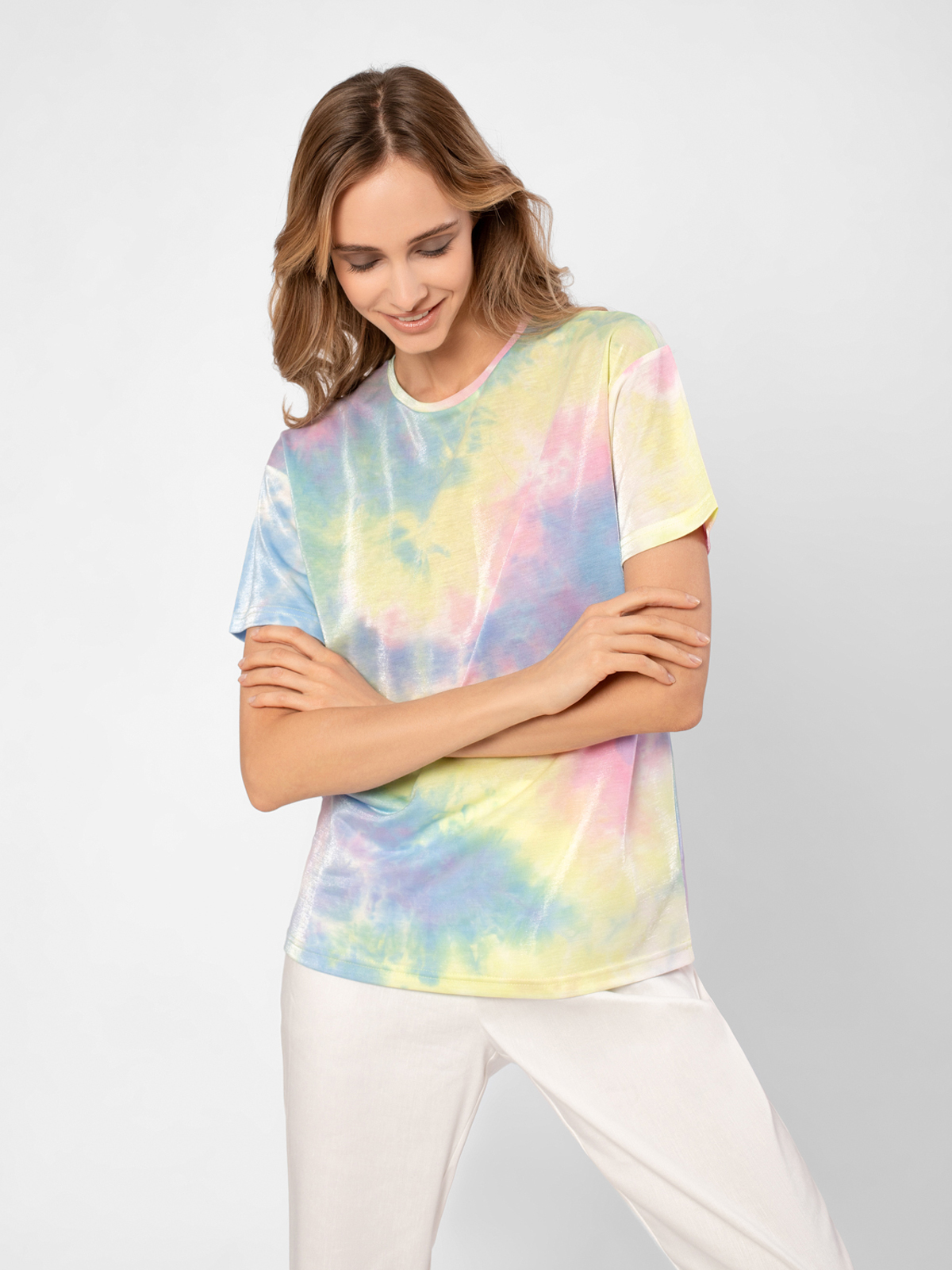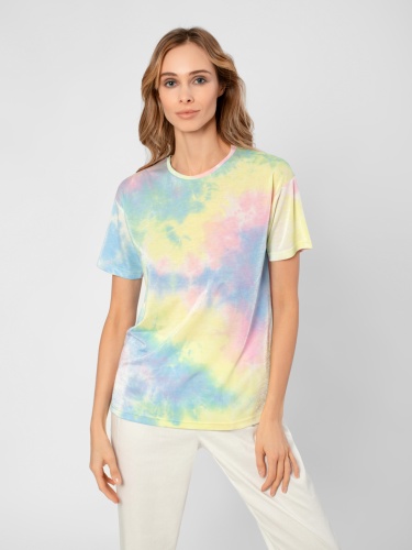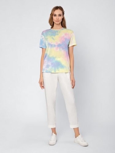 Футболка из хлопкового трикотажа прямого силуэта с круглой горловиной и коротким втачным рукавом.