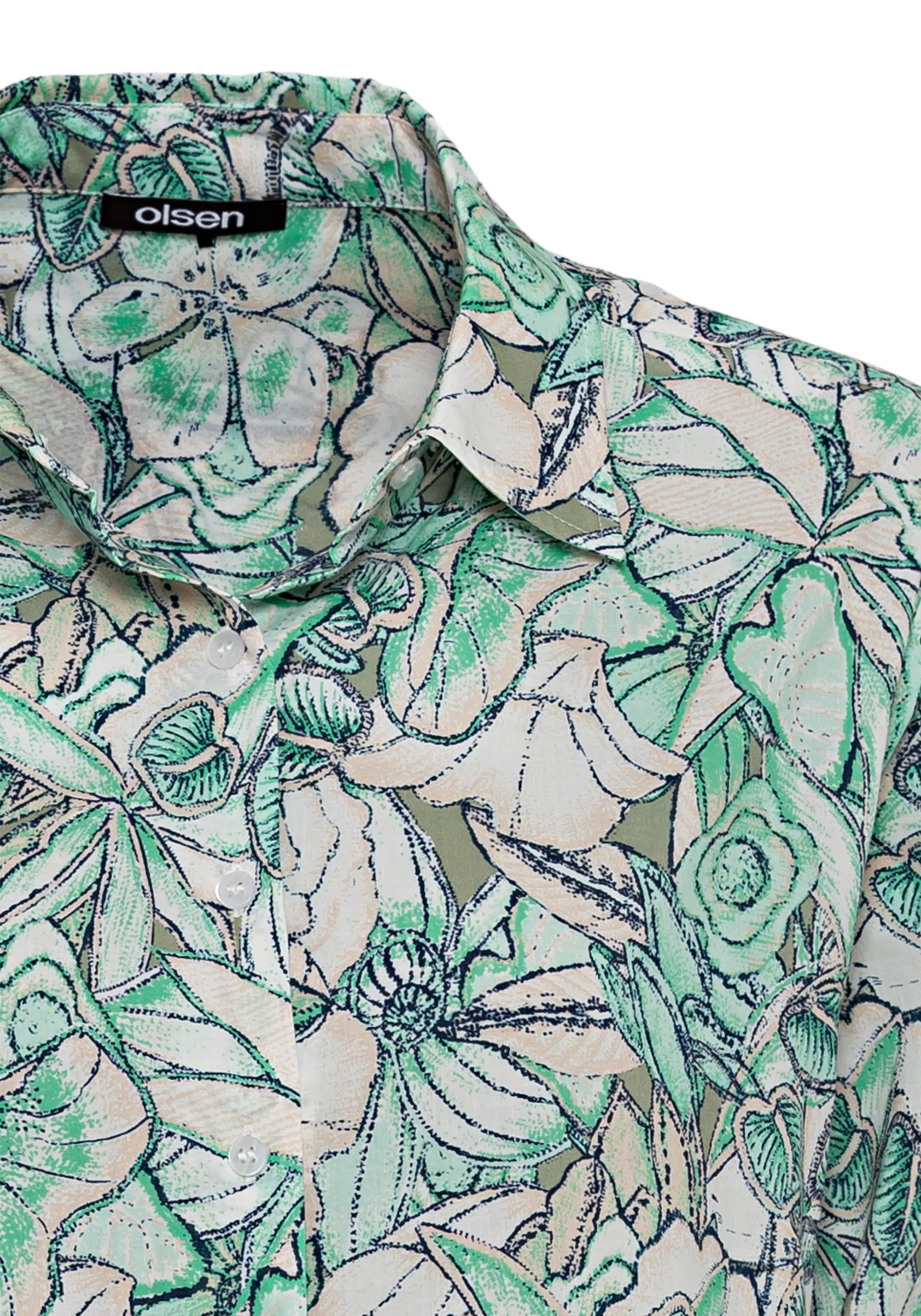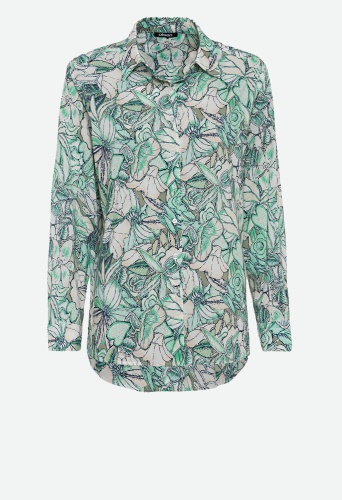 На сайте указаны Российские размеры. Блуза с цветочным принтом передает классический силуэт и утонченный стиль с воротником, сплошной планкой на пуговицах и манжетами на пуговицах. Блузка сзади немного длиннее, чем спереди.