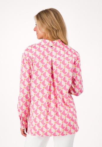 Отличным выбором для летних месяцев станет свободная блуза с отложным воротником и геометрическим узором. Изготовлен из 100% хлопка, удобен в носке и приятен на ощупь. Свободный крой также обеспечивает большую свободу движений и является идеальным выбором, особенно в теплое время года. Сочетайте блузку с блейзером для офисного образа или небрежно с джинсами, в ней вы всегда будете чувствовать себя комфортно.