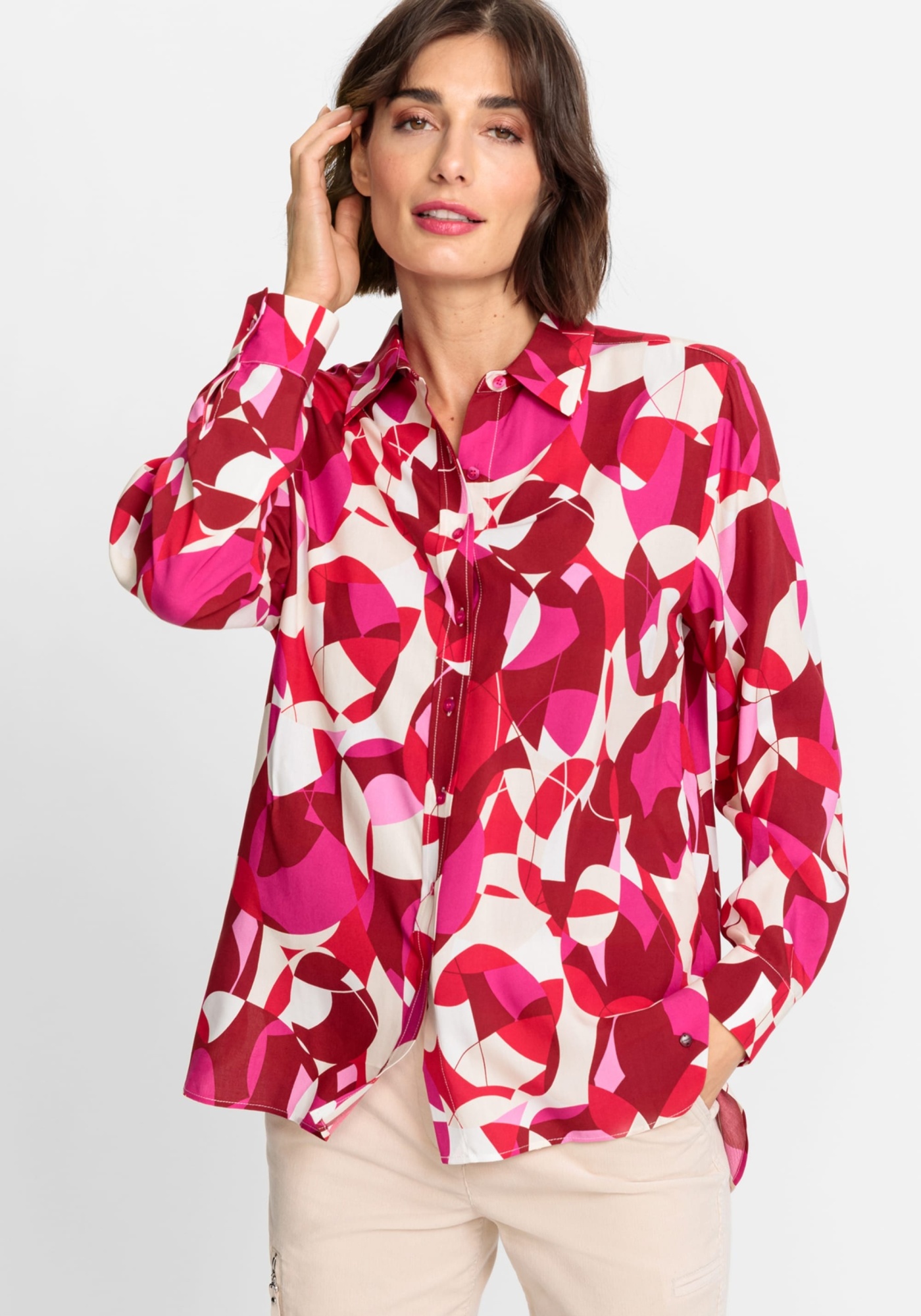 Классическая рубашка с воротником. Украшаена сплошным геометрическим узором в ярких тонах, напоминающий о 70-х годах. Эта легкая рубашка с струящейся драпировкой имеет планку на пуговицах спереди и рукава с манжетами.
