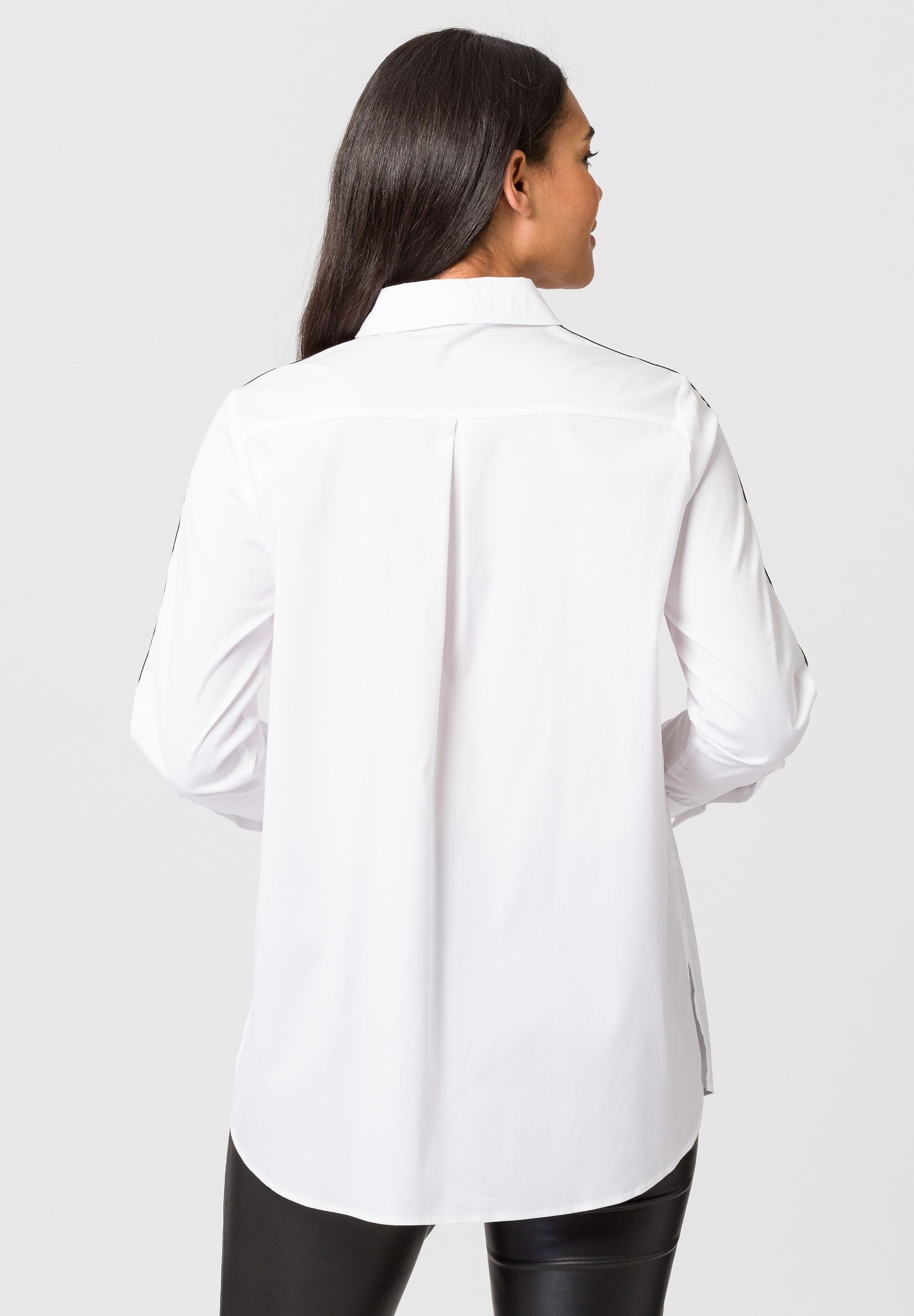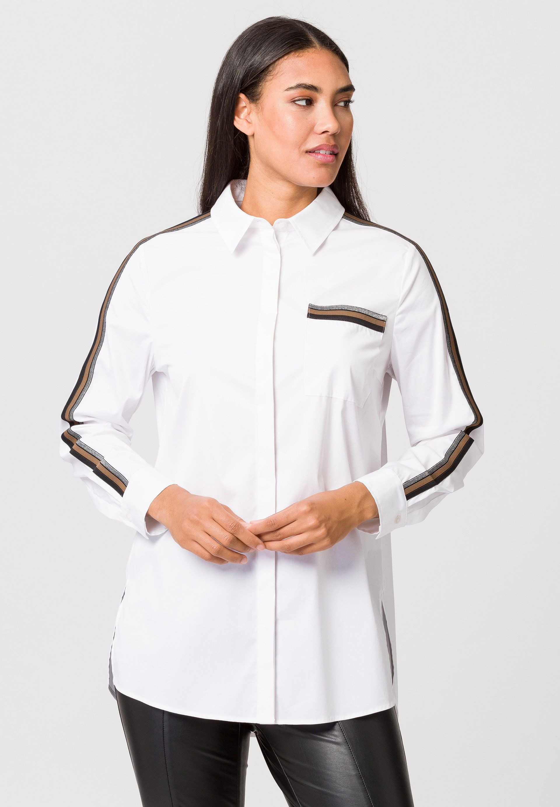 Длинная женская блузка со потайной планкой на пуговицах во всю длину. И еще одна надежная тенденция с универсальным потенциалом: классическая блузка-рубашка в повседневном длинном крое. Классический элегантный стиль может сочетаться как элегантно, так и непринужденно. Эта модель облегающего кроя из смесового хлопка дополнена накладными декоративными полосками вдоль нагрудного кармана и манжет рукавов. Высокие разрезы по низу позволяют длинному фасону идеально сочетаться с узкими или широкими брюками, юбками и джинсами.