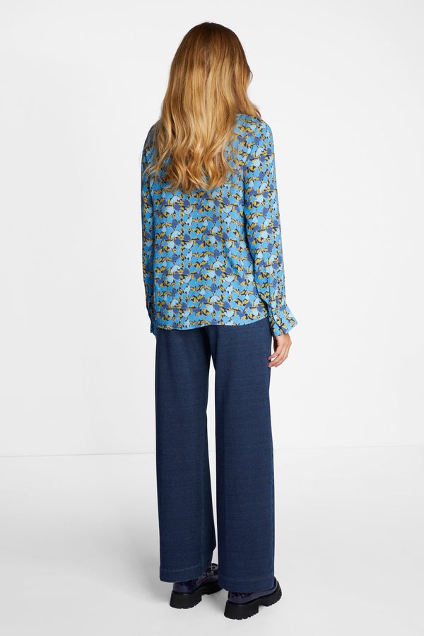 Рубашка свободного кроя украшена ярким акварельным принтом на мягкой струящейся вискозе из переработанных материалов. Модель с классической планкой на пуговицах и воротником.