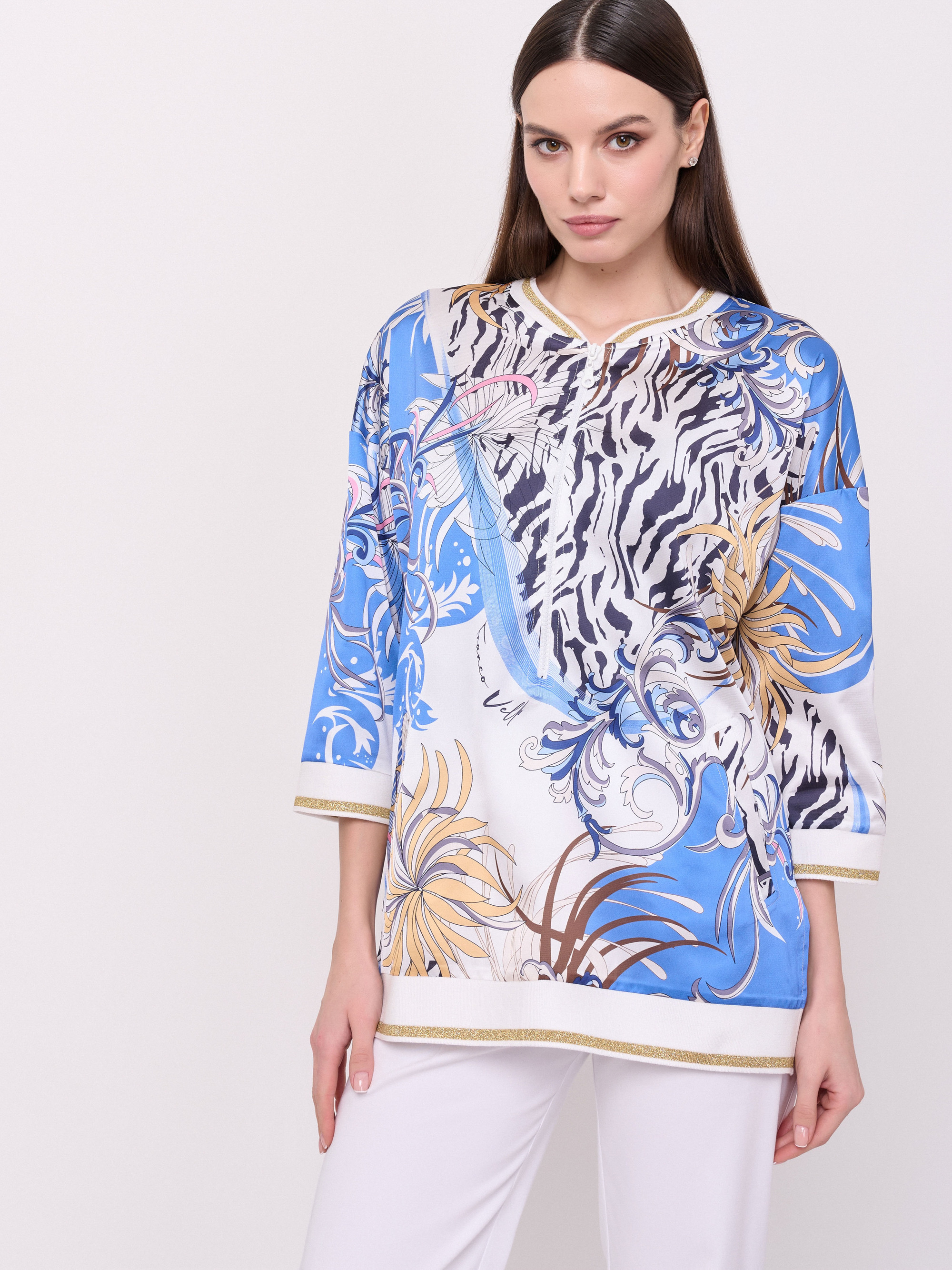 Детали: застежка молния, вырез горловины воротник-стойка, рукава 7/8, покрой прямой, рисунок цветы и растения, боковые разрезы, трикотажные манжеты с люрексом. Длина по спинке: 69 см.