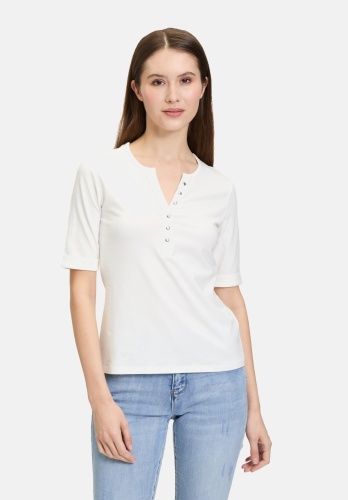 Слегка приталенная базовая рубашка с короткими рукавами и круглым вырезом впечатляет своим простым однотонным дизайном. Планка с пуговицами добавляет дополнительный акцент и придаёт рубашке современный вид. Облегающий крой выгодно подчеркивает фигуру и делает её идеальным повседневным предметом гардероба, который можно комбинировать с различными образами.