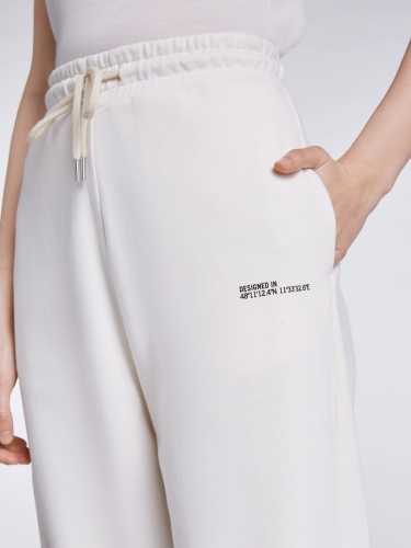 Брюки в спортивном стиле из смесового хлопка. Эластичный пояс с кулиской обеспечивают идеальную посадку по фигуре. Акцент в виде маленькой надписи на левой штанине. Длина 42 размера: 102 см. Рост модели 179 см, ее размер – 42 (российский).