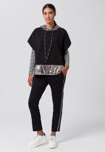 Однотонные брюки в спортивном стиле. Прямой силуэт, укороченная длина. Комфортная средняя посадка. Лампасы в цвете металлик сбоку брючин.