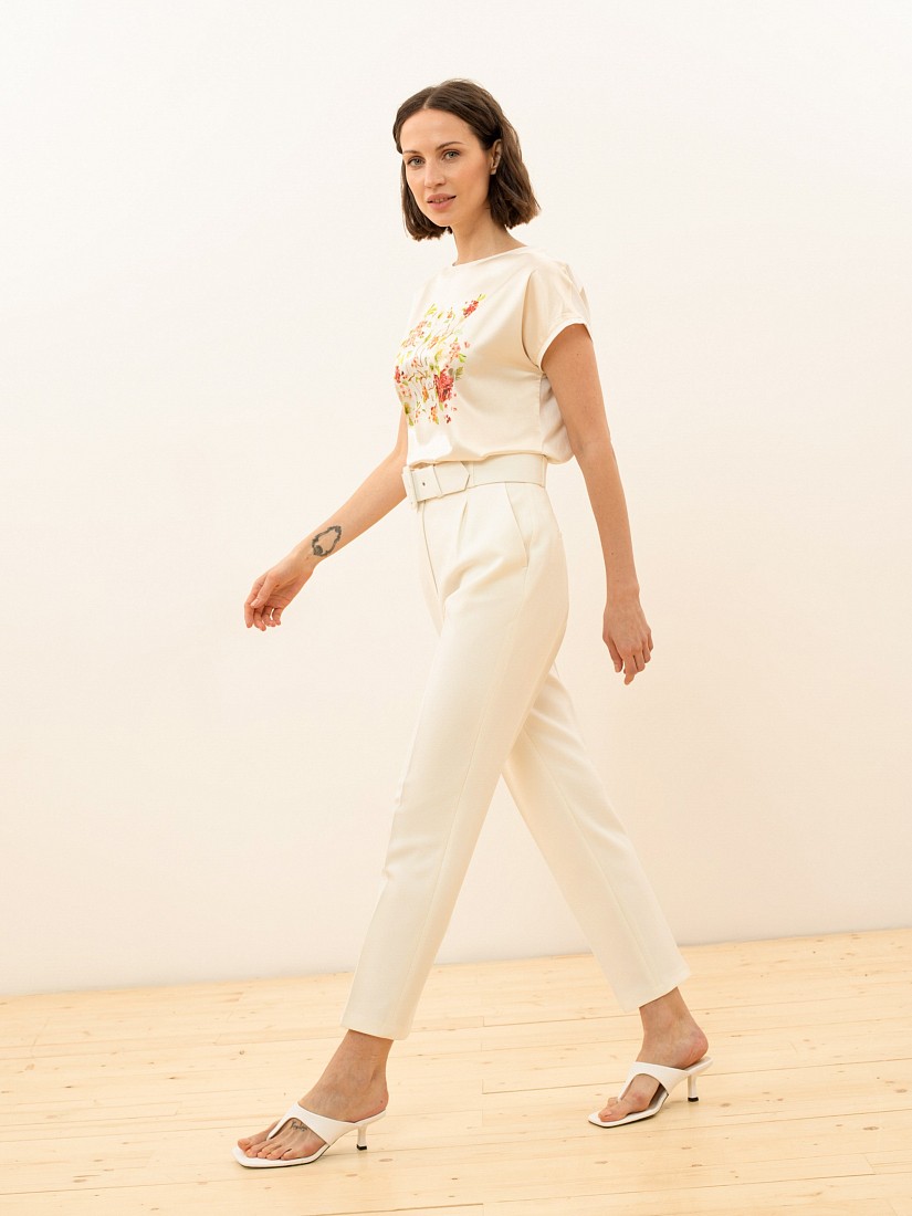 Однотонные классические брюки с высокой посадкой - элемент базового делового гардероба. Идеально подходят для офиса или повседневного ношения. Длина 7\8 оголяет щиколотку и визуально стройнит силуэт, а стрелки вытягивают рост. Застежка на молнию и брючный крючок. В комплекте идет широкий ремень с пряжкой, обтяжные основной тканью изделия.