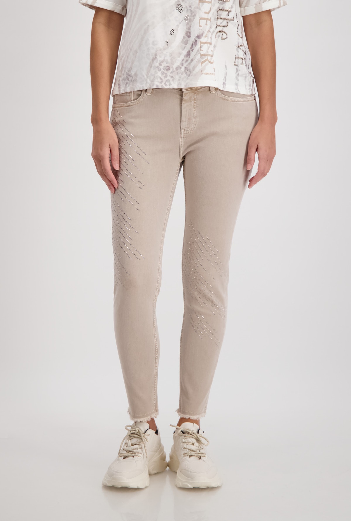 На сайте указаны российские размеры. Узкие джинсы с пятью карманами и эффектными стразами. Узкий крой с петлями для ремня на поясе, классическая посадка и пять карманов. Низ штанин украшен стильной бахромой, а сверкающие полоски со стразами эффектно украшают модель. Параметры модели: 42 размер, рост 179 см