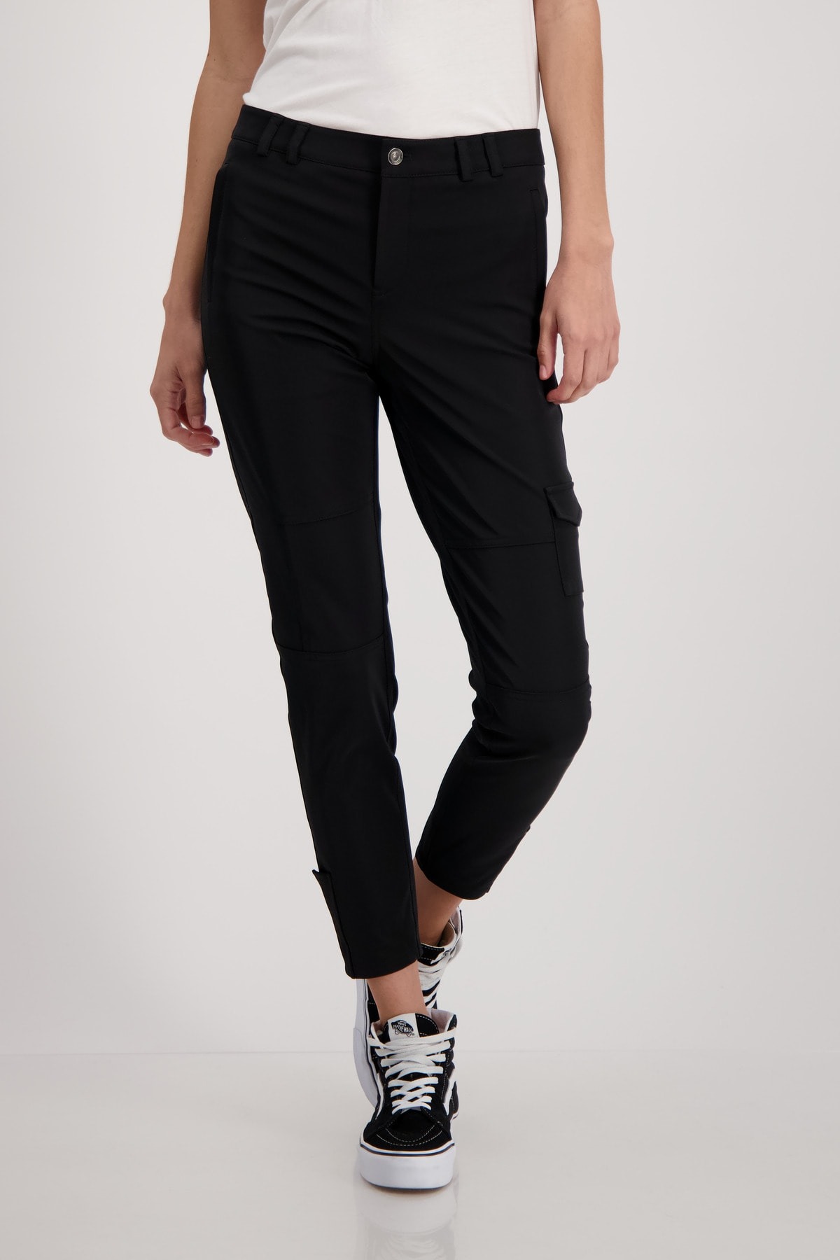 На сайте указаны российские размеры. Черные брюки с подворотами зауженного кроя. Чрезвычайно эластичное и простое в уходе качество. Благодаря высокому содержанию эластана в штанах так же легко двигаться, как и в спортивных штанах. Прямой пояс с петлями для ремня, пуговицей и потайной молнией. Передняя часть имеет боковые прорезные карманы со потайной молнией, горизонтальные и вертикальные разделительные швы и накладной карман с клапаном на уровне колена. Разрез со вставкой и декоративная планка на кнопках украшают штанины. Рост модели 179 см