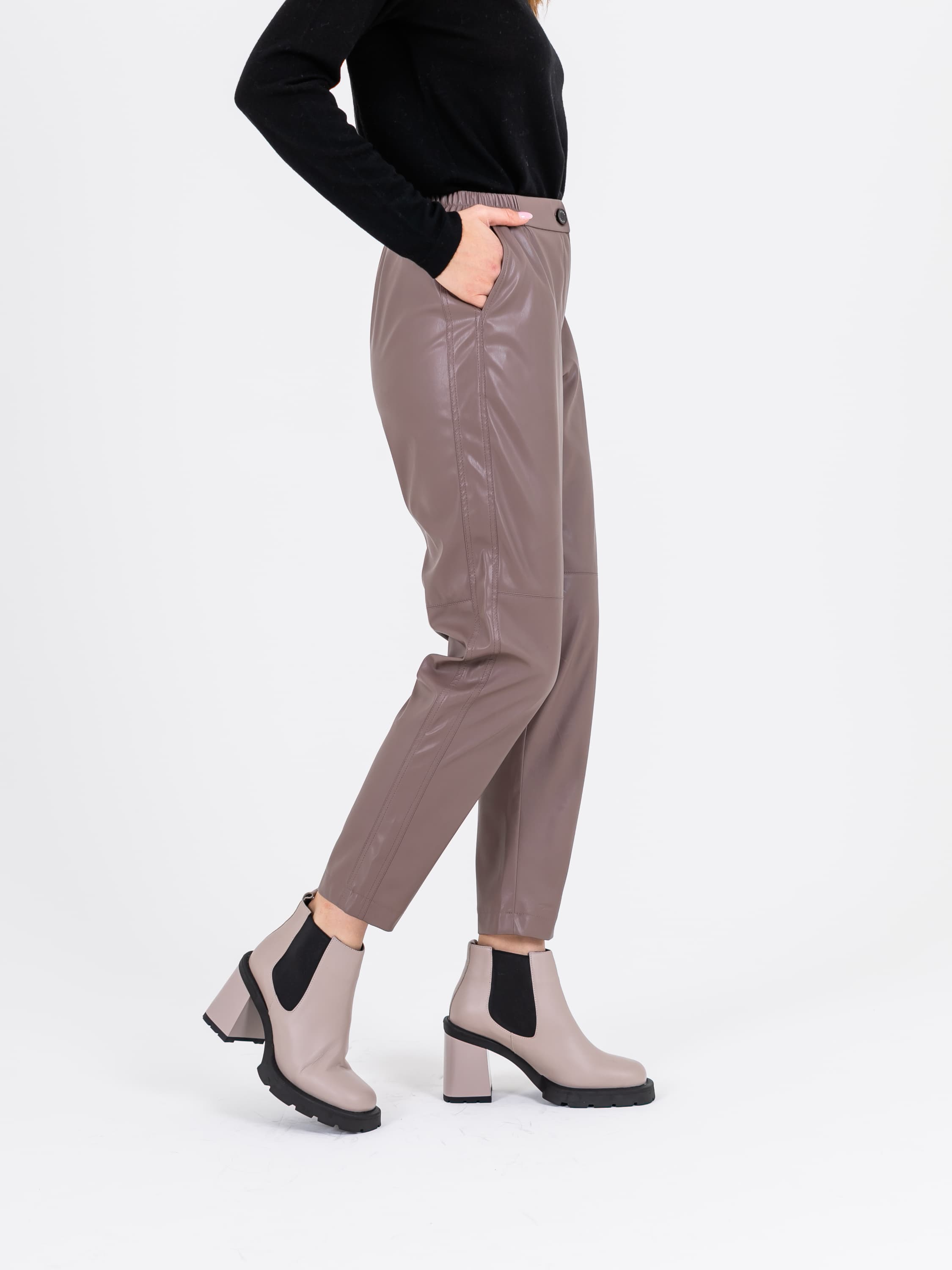 На сайте указаны российские размеры. Брюки из экокожи слегка укороченные в бежевом цвете. Впереди застежка на молнию и пуговицу, сзади эластичная резинка. Модель имеет 2 кармана спереди. Ткань: искусственная кожа высокого качества (55% полиуретан, 40% поливискоза, 5% эластан). Практичный материал, загрязнения с которого легко удаляются влажной салфеткой, что особенно актуально в межсезонье. Крой: прямой свободный силуэт создает идеальную вертикаль, которая визуально вытягивает и стройнит фигуру, корректируя область бедер. Имеют актуальную высокую посадку. Удобные карманы по бокам вместят все самое важное, что может пригодиться в ближайшее время. Застегиваются на пуговицу и молнию. Стильный оттенок тауп подчеркнет прекрасный вкус и чувство стиля. Отделка: верхняя и нижняя часть брюк разделяются неконтрастной строчкой, которая добавляет оригинальности, но не перегружает образ. Рост модели 175 см.