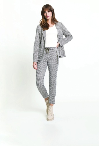 На сайте указаны российские размеры. Брюки средней посадки в ломаную клетку, регулируемые тесьмой на талии. Боковые карманы на молнии и прорезные карманы сзади. Слегка зауженная штанина с резинкой. Длина: 72 см в 44 размере.