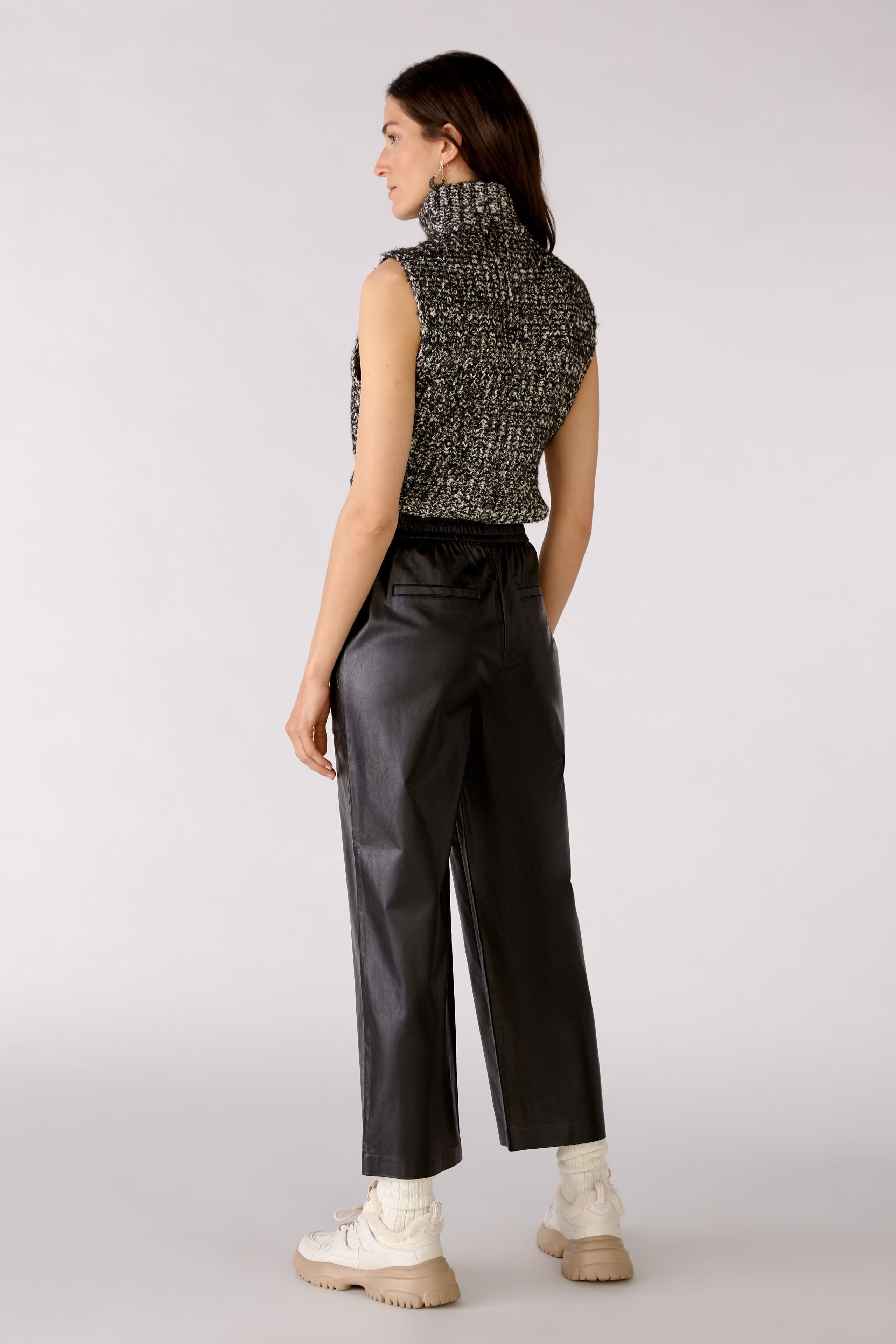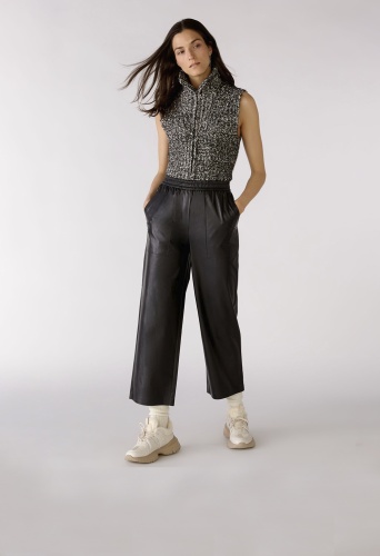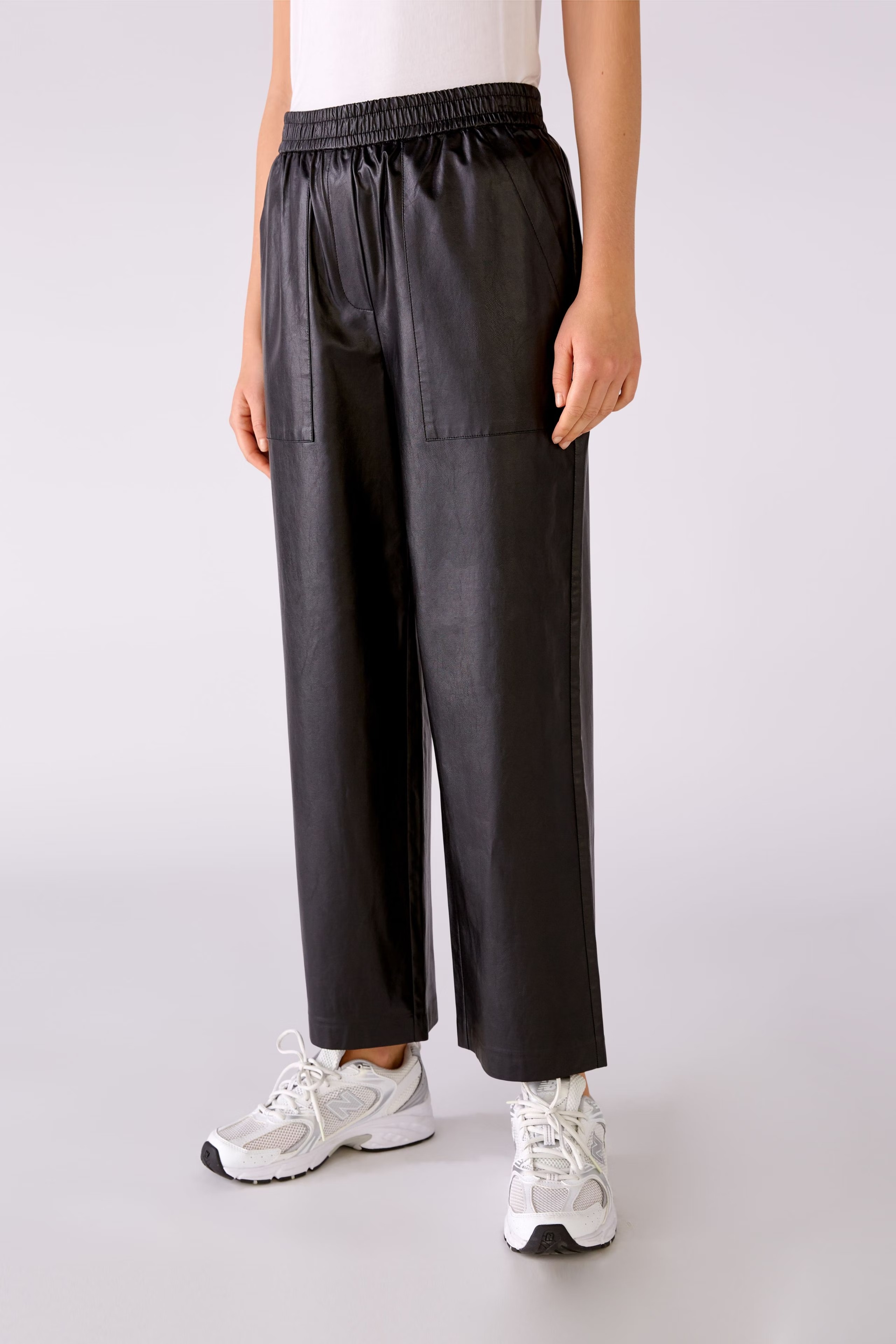 На сайте указаны российские размеры. Брюки из сверхмягкой синтетической кожи, пропитанной вискозой внутри. Удобные, свободного кроя укороченной длины. Джоггер с эластичными манжетами. Отличительные карманы с наклонным отверстием. Рост модели 178 см. Длина в размере 44: 68 см