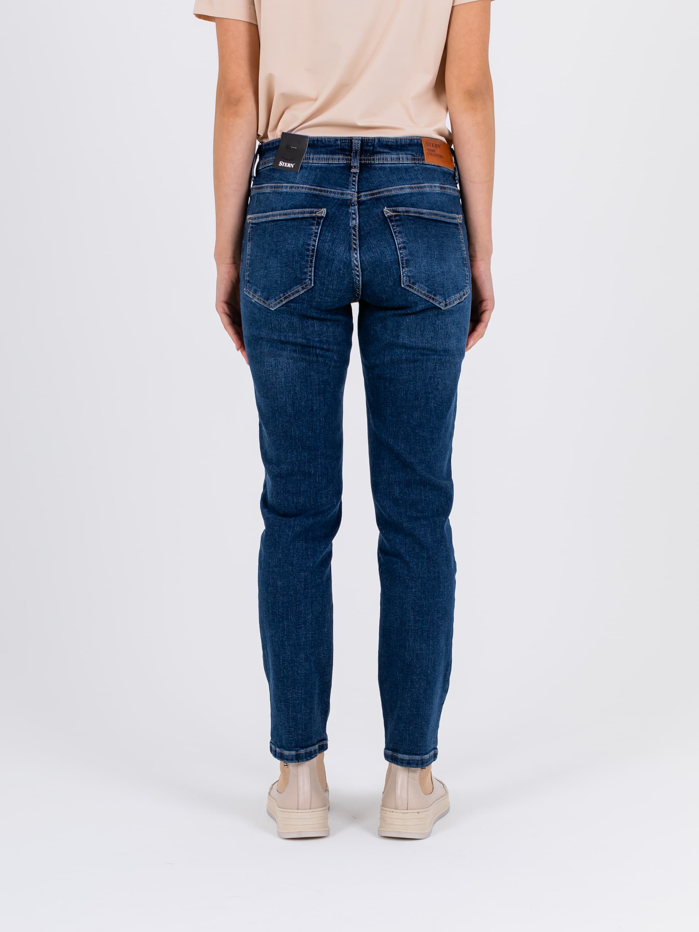 Длинные джинсы «Slim Fit» с застежкой на молнию и 1 пуговицу. Джинсы слегка зауженные книзу, с легким варёным эффектом. На передних половинках расположены два кармана с отрезным бочком и один монетный карман. На задних половинках два накладных кармана и фигурная кокетка. Верх брюк обработан поясом со шлевками.