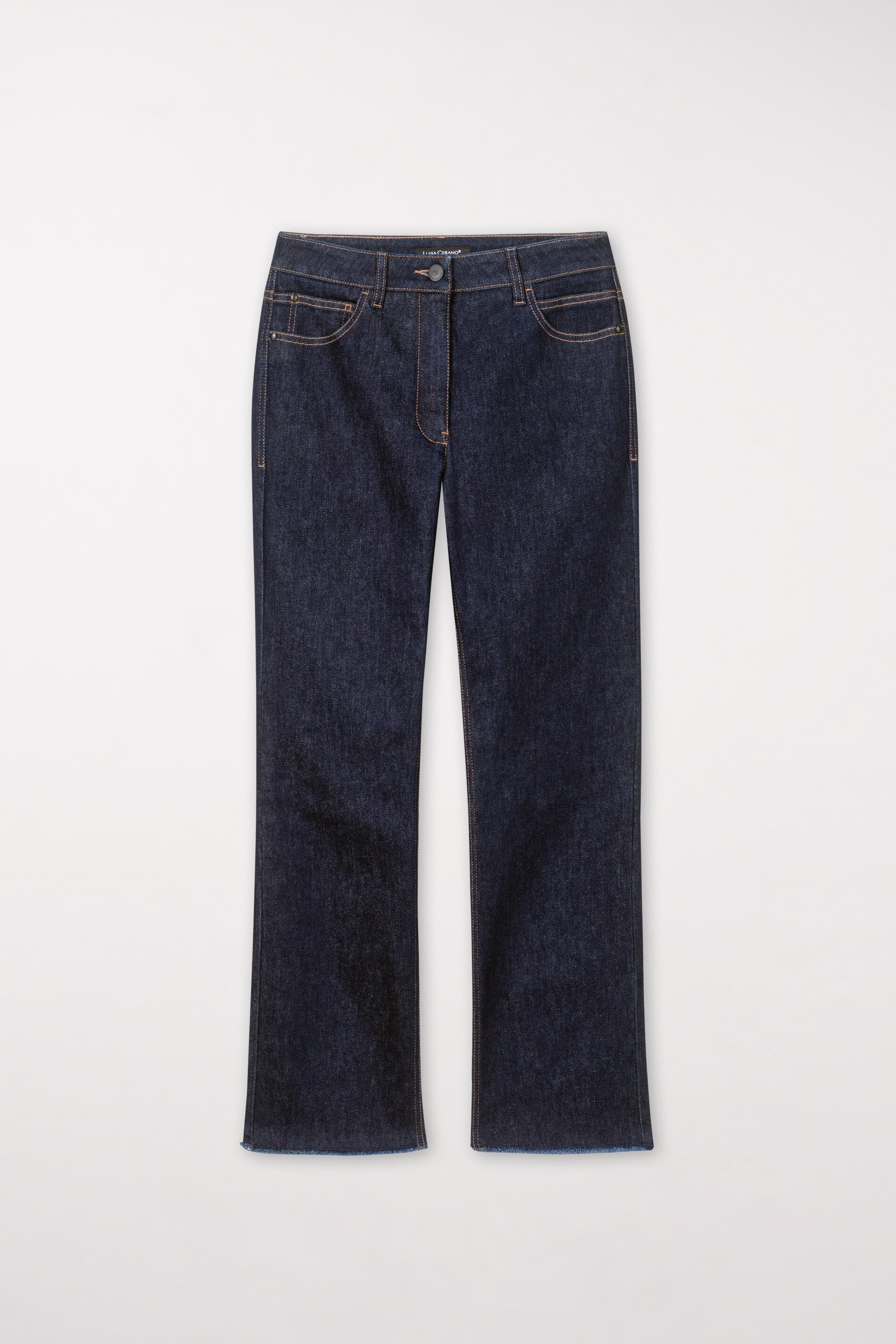 На сайте указаны российские размеры. Укороченные джинсы из аутентичного высокоэластичного денима с расклешенным силуэтом. Элегантные брюки с эффектом потертости, классическим дизайном с пятью карманами и открытой кромкой. Рост модели 178 см