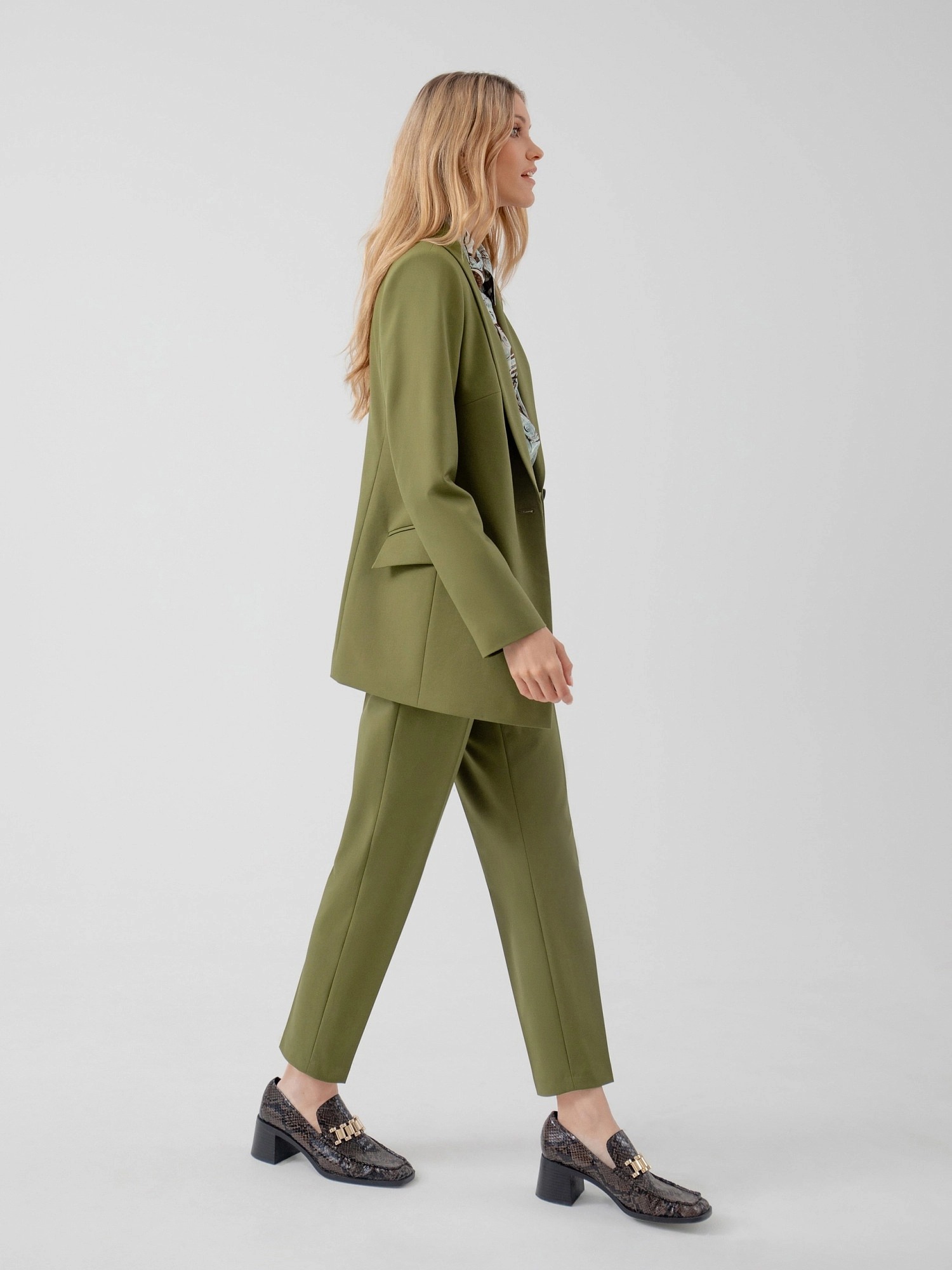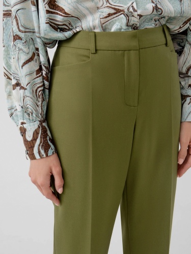 На сайте указаны российские размеры. Классические брюки со стрелками прямого силуэта на притачном поясе со шлевками и рабочими карманами по бокам фигурной формы. Застежка спереди на молнию и крючок. Сзади прорезные карманы с листочками. Рост модели 175 см.