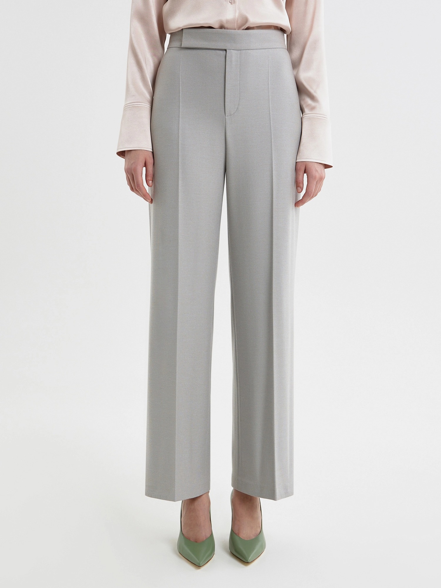 Брюки со стрелками прямого силуэта слегка расклешенные к низу, выполнены из костюмной ткани в бежево-голубом цвете. На притачном поясе, застежка спереди на молнию и крючок. Брюки без карманов.