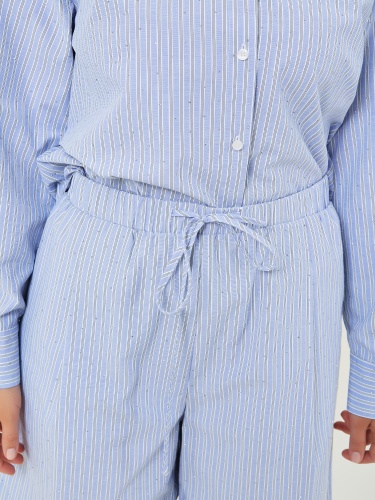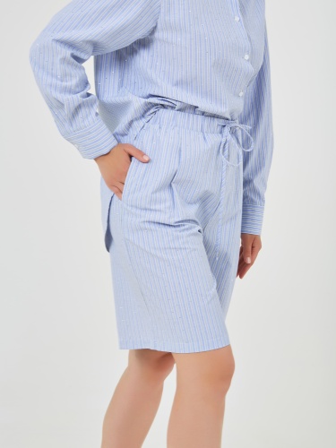 Шорты с эластичным поясом и завязками выполнены в светло-голубом цвете с тонкими вертикальными полосками и стразами, что придаёт им свежий и стильный вид. Коллекция Весна-Лето 2025. Капсула "Санторини". Параметры модели: 89-70-92, рост 167, размер 44-46