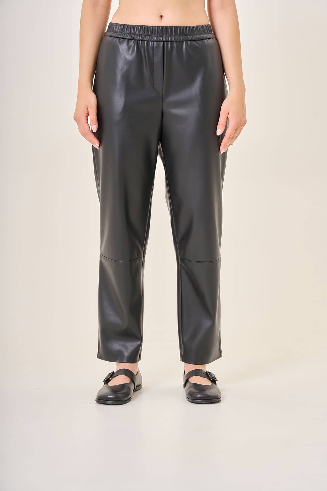 Черные штаны из эко-кожи на средней посадке. Эластичный пояс обеспечивает максимальный комфорт. Центральная строчка спереди создает элегантный акцент на коленях, подчеркивая стройность ног. Тщательно продуманная конструкция идеально садится на любую фигуру, подчеркивает достоинства и придает уверенности. Материал приятен к телу и сохраняет форму даже после многократных стирок. Осень-Зима'25/26. Капсула "Вишневый сад"