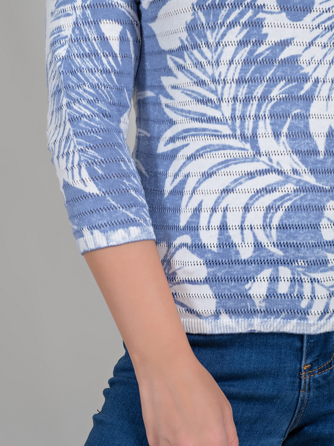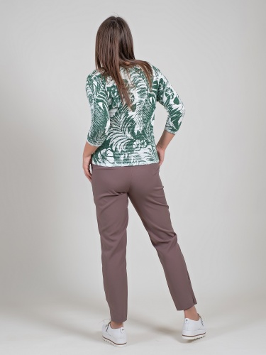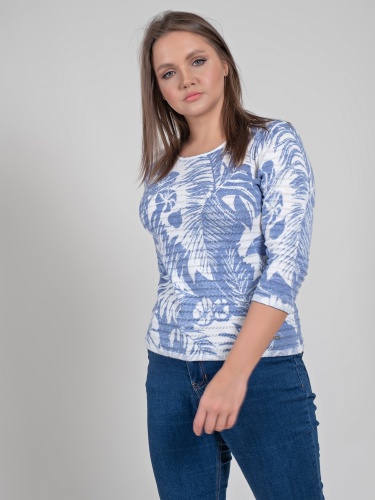 Легкий джемпер из 100%-го хлопка выполнен в тропическом узоре. Материал позволяет коже дышать, приятен к телу. Прямой крой скрывает недостатки фигуры и придает легкость силуэту. Втачной рукав 3\4 оголяет предплечья и визуально стройнит силуэт. Горловина-лодочка выгодно подчеркивает изящество линии шеи. Футболку можно как заправить под юбку или брюки, так и носить навыпуск.