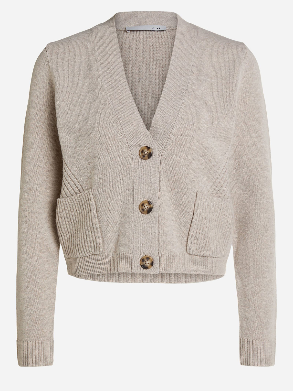 Укороченный кардиган с деталями в рубчик. Женственный V-образный вырез, планка с тремя пуговицами. Два практичных накладных кармана. Длинные втачные рукава. Длина 50 см для размера 42. Рост модели 178 см, ее размер – 42 (российский).