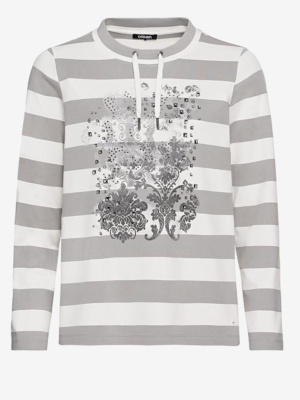.Джемпер прямого кроя в широкую бело-серую полоску. Прямой силуэт, круглый вырез горловины. Спереди изящный, женственный узор.