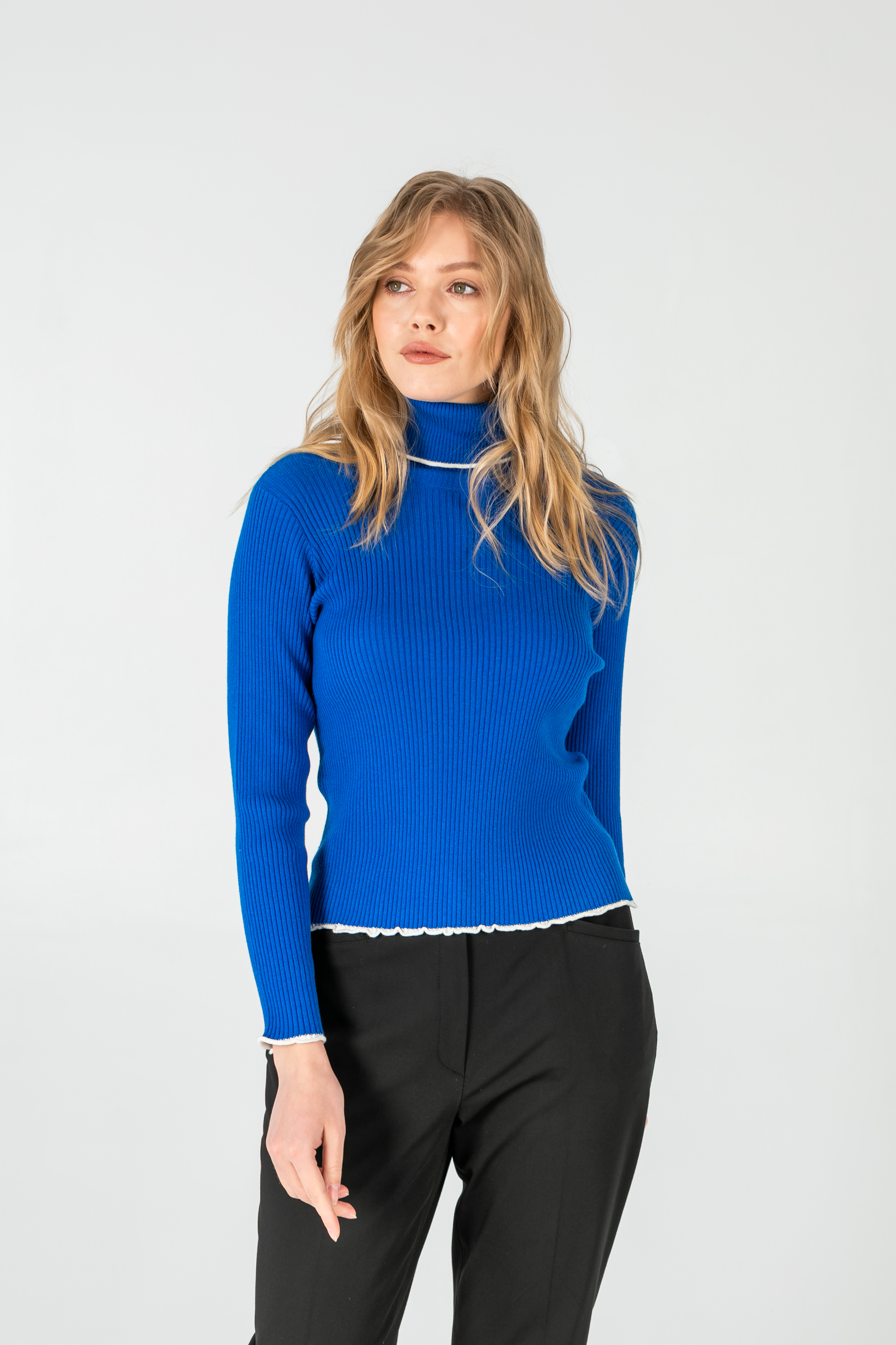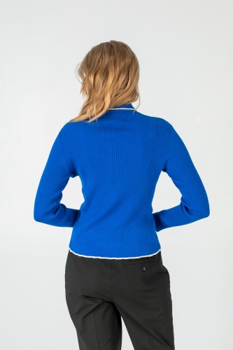 На сайте указаны российские размеры. Ткань: 50% хлопок, 50% акрил. Крой: однотонный джемпер-водолазка с высоким горлом в мелкий рубчик. Приталенный силуэт подчеркивает красоту фигуры, но благодаря достаточной плотности материала ее возможные недостатки не выглядят так явно. Прикрывает зону живота, не поднимается вверх при движении. Джемпер представлен в двух стильных оттенках – кирпичном и синем электрик. Отделка: ворот и рукава отделаны белой волнистой канвой, которая смотрится свежо и контрастно. Идеальный партнер для синих джинсов или темных брюк из коллекции Stern.