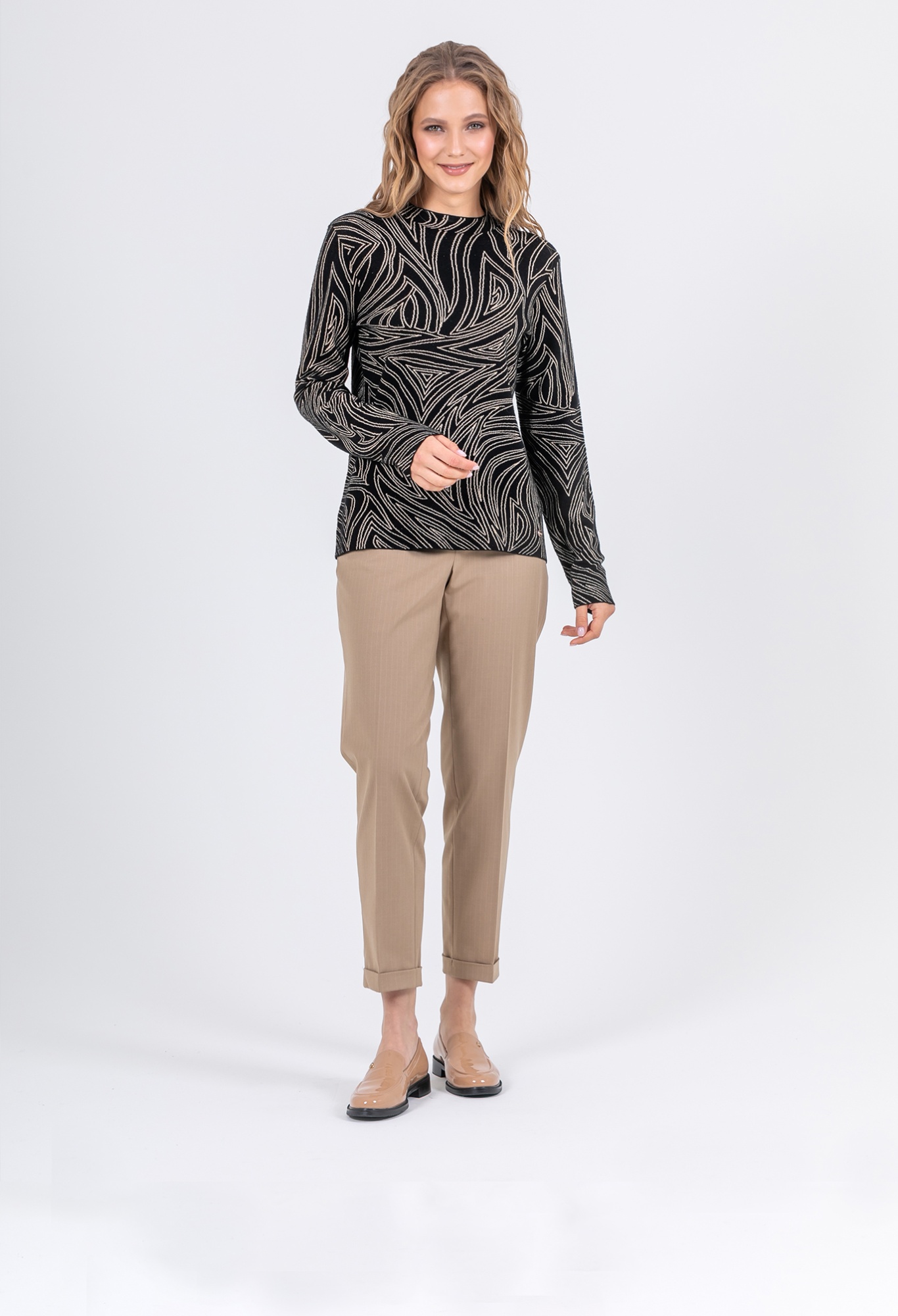 На сайте указаны российские размеры. Ткань: выполнен из смесовой ткани средней плотности. В составе высококачественная овечья шерсть (79,2%) для непревзойденного тепла, нейлон (13,4%) и полиэфирное пленочное волокно (7,4%) для эластичности. Крой: слегка приталенный женственный джемпер средней длины. Модель с удлиненными рукавами и воротом идеально садится по фигуре, подчеркивая ее достоинства, дарит мягкое тепло и уют. Свободные рукава дарят комфорт и не сковывают движения. Длину рукава можно регулировать подгибкой. Отделка: абстрактные узоры на ткани делают образ интересным и запоминающимся. Поддержите лаконичность образа юбками и брюками черных или бежевых оттенков в цвет узора.