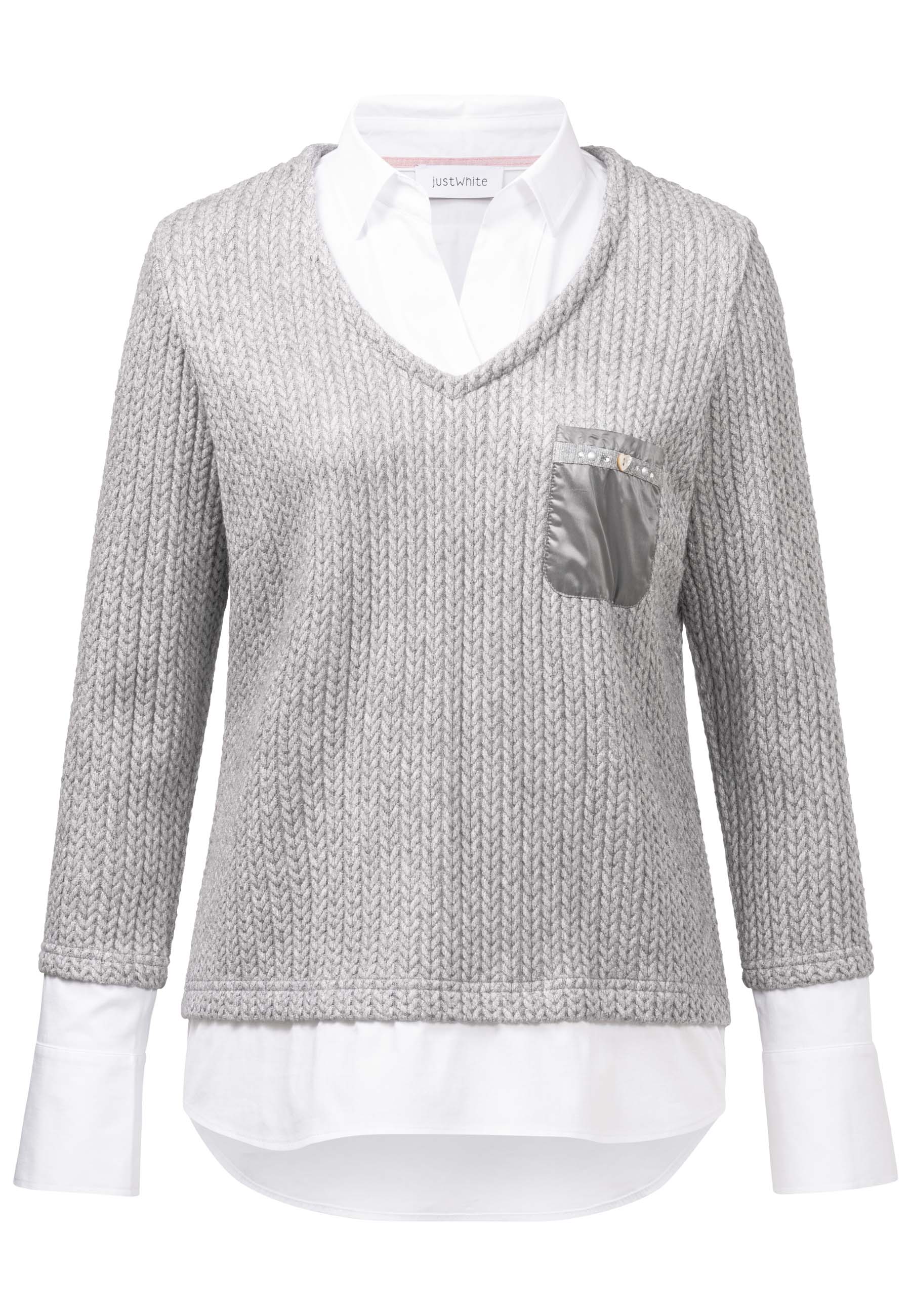 На сайте указаны российские размеры. Этот пуловер «два в одном» умело устраняет грань между повседневностью и шиком — благодаря блузочной вставке с рубашечным воротником в пуловере вы можете легко создать прекрасный образ. Благодаря удлиненной задней части свитер 2 в 1 создает красивый силуэт. Внешний вид грубой вязки привлекает внимание в сочетании с прикрепленным карманом из мерцающего контрастного материала. Блестящие детали прекрасно завершают детализированный стиль уникального свитера! Рост модели 177 см Измерения для 44 размера: Окружность груди: 104 см Талия: 101 см Ширина бедер: 110 см Длина спинки: 70 см Длина рукава: 62 см