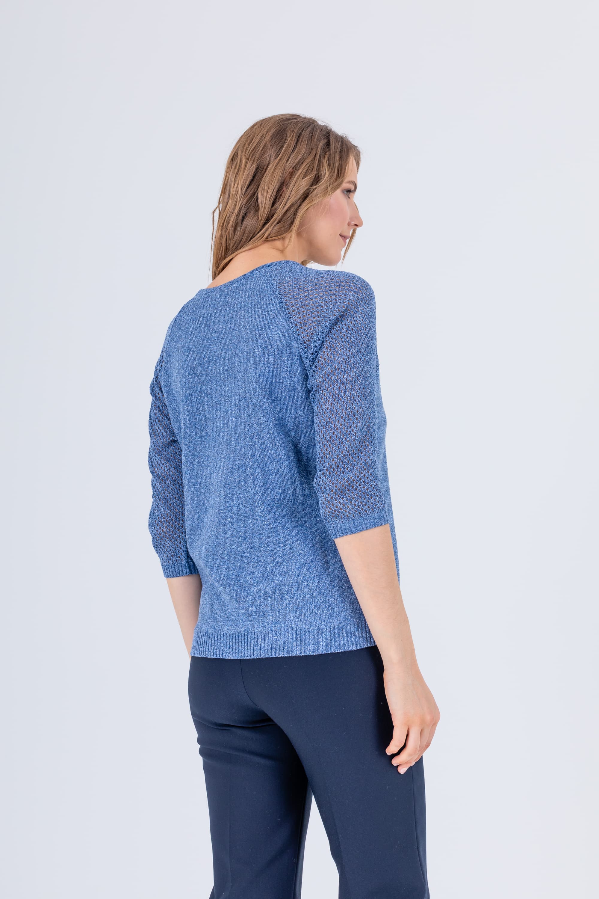На сайте указаны российские размеры. Джемпер средней длины прямого силуэта из легкого хлопка с добавлением полиакрилонитрила, дизайнерская особенность модели – ажурный трикотаж на рукавах. Перед и спинка по низу обработаны манжетой. Рукава реглан ¾ с манжетами. Круглый вырез горловины.