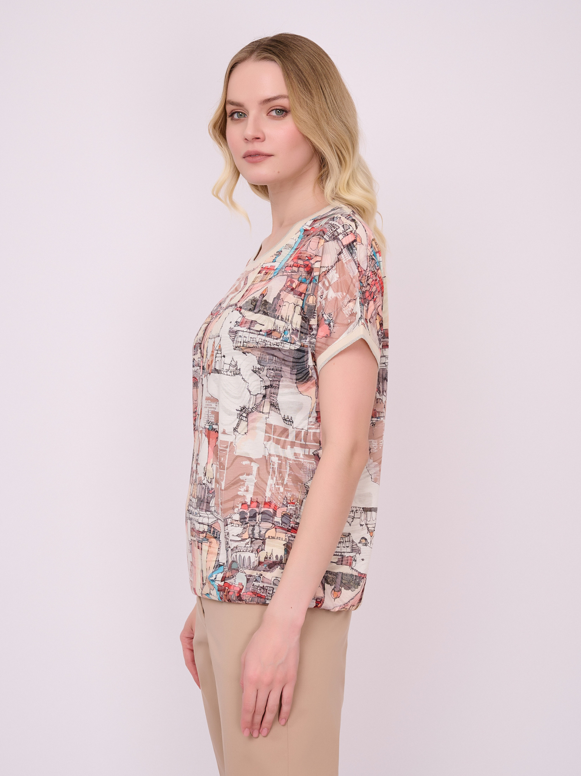 На сайте указаны российские размеры. Трикотажная футболка с короткими цельнокроеными рукавами и низом на резинке. Длина по спинке: 60 см. Рост модели 175 см.