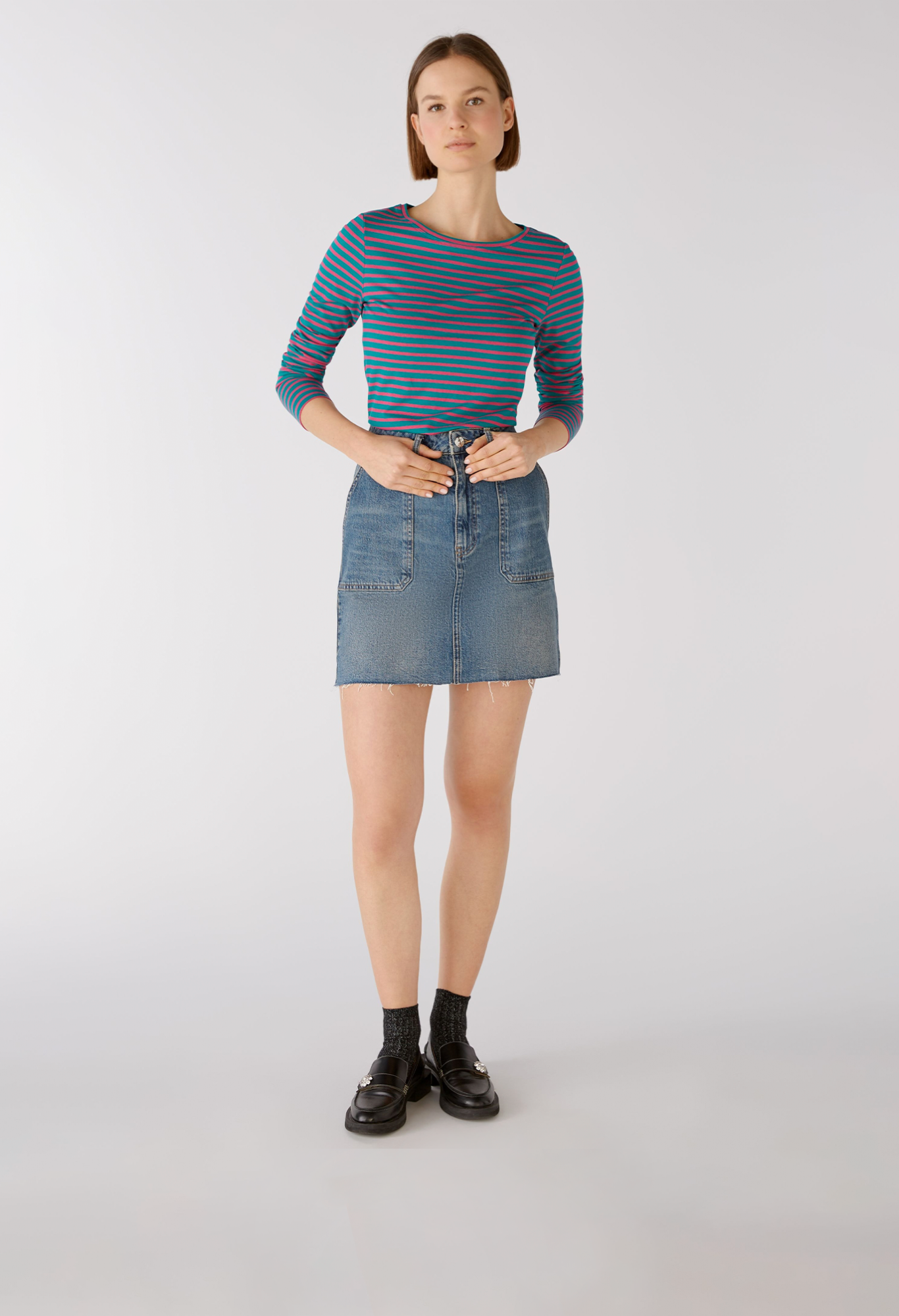 Базовая рубашка из комфортного хлопкового модала с трикотажными полосками. Слегка приталенный крой, стандартная длина. Шея круглая с красивой отделкой. Длинная рука. Разрезы по боковым швам. Длина для размера 42 - 64 см.