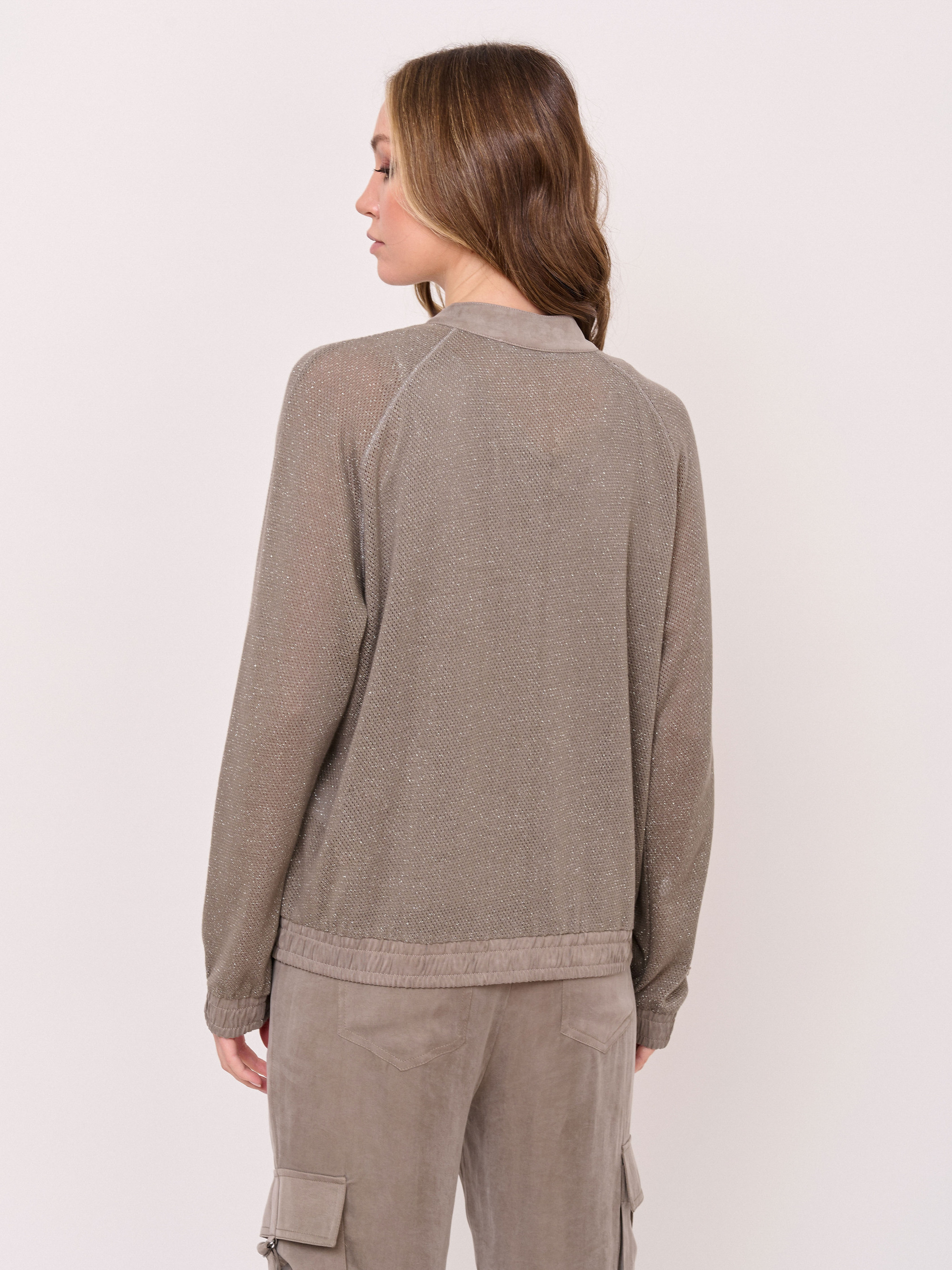 Детали: ажурный трикотаж, застежка молния, вырез горловины воротник-стойка, рукава-реглан длинные, карманы накладные, манжеты на резинке. Длина по спинке: 58 см.