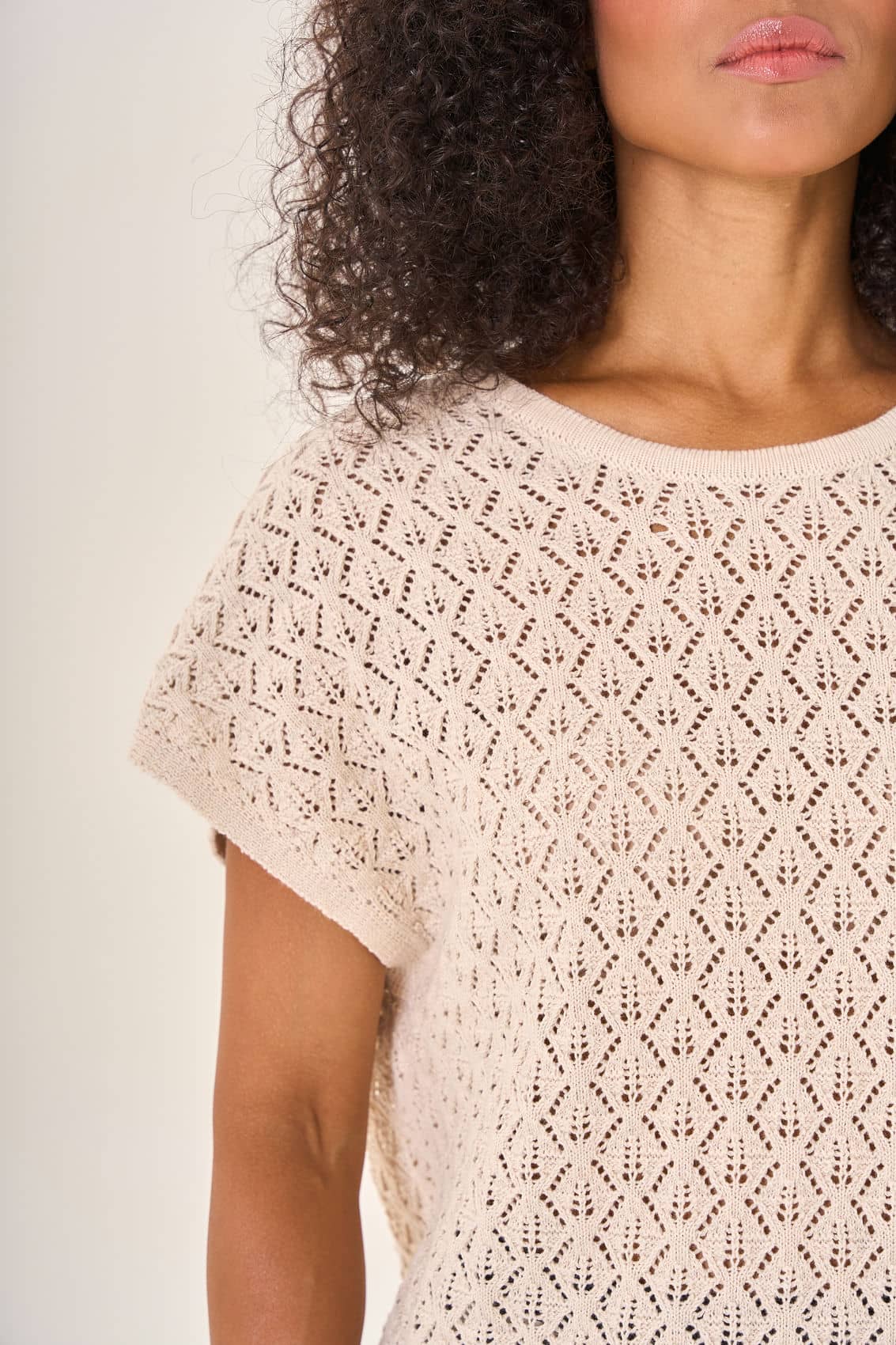 Бежевая вязаная кофта с короткими рукавами. Рельефный узор в виде ромбов добавляет изделию выразительности и уникальности. Мягкий натуральный материал обеспечивает комфорт. Универсальная модель прекрасно дополнит любой наряд, придавая ему уютный и гармоничный вид.