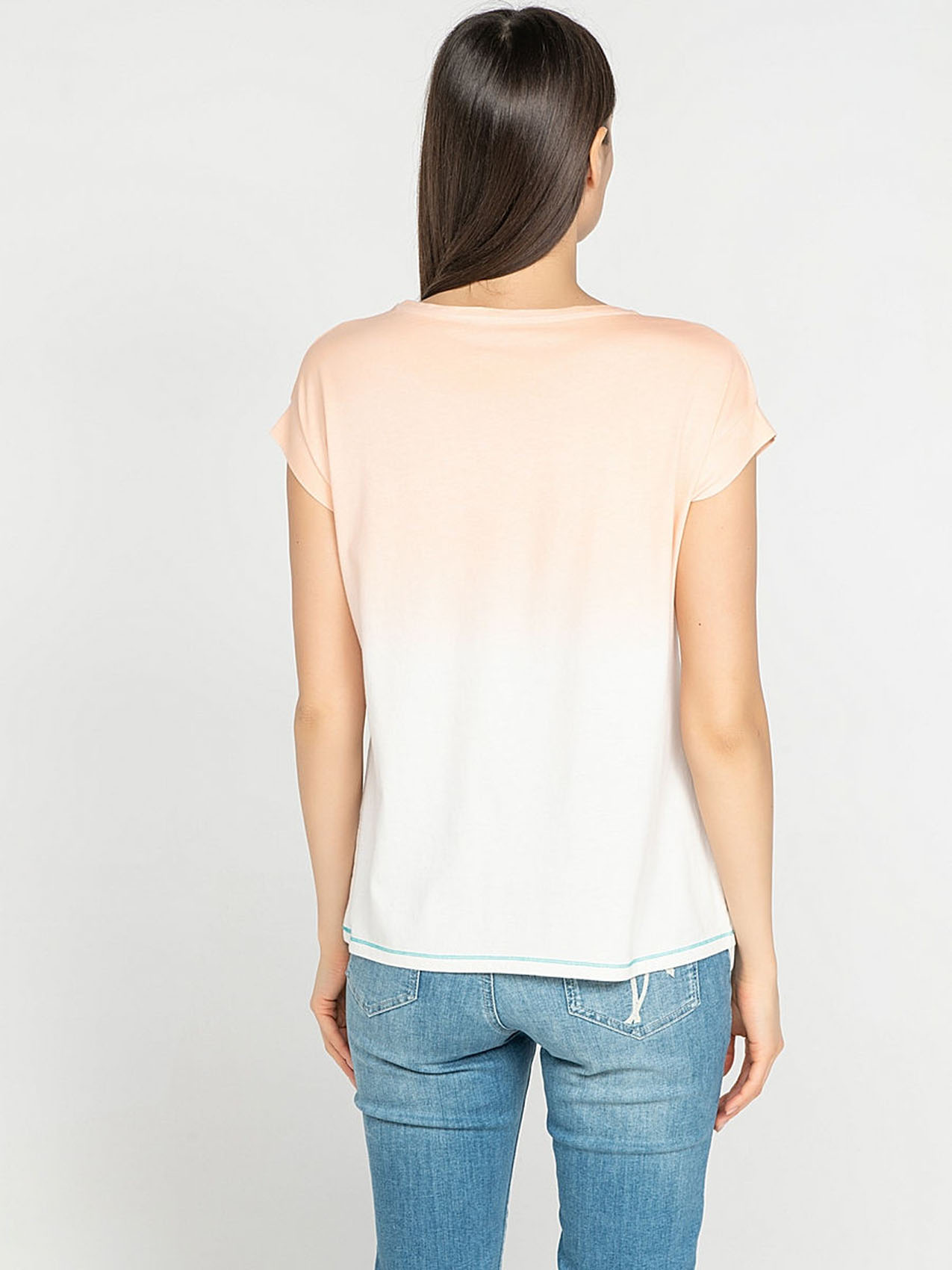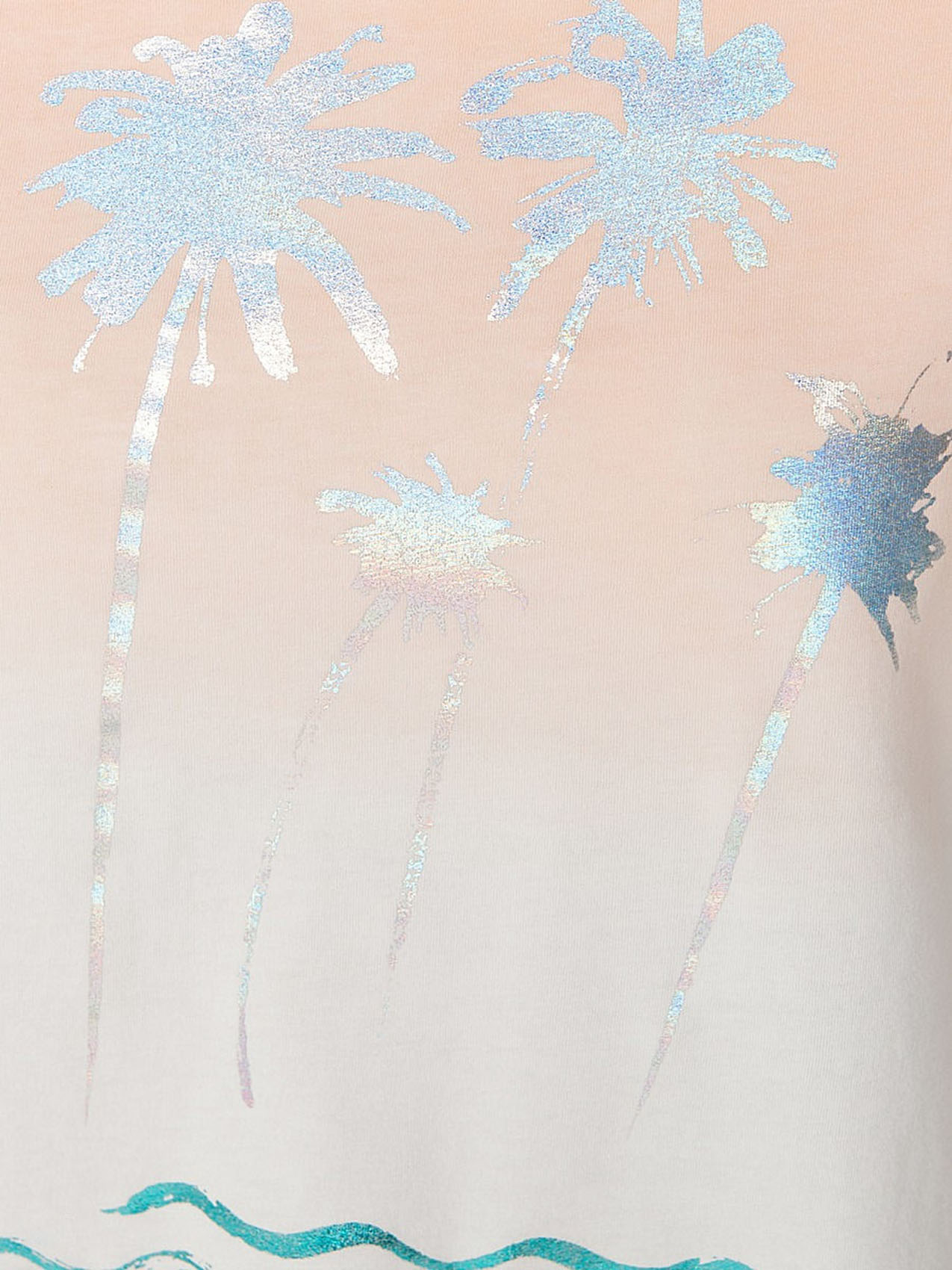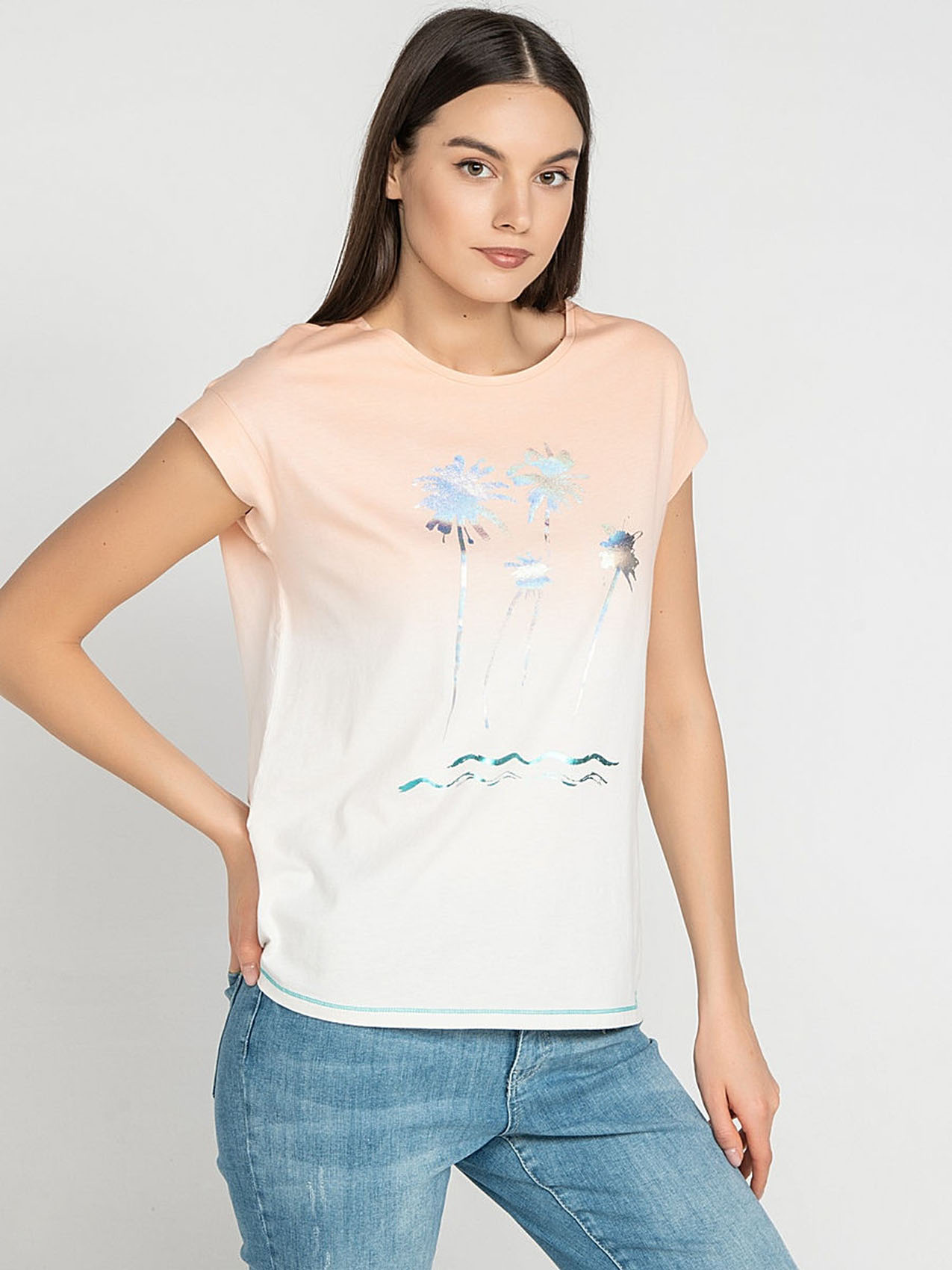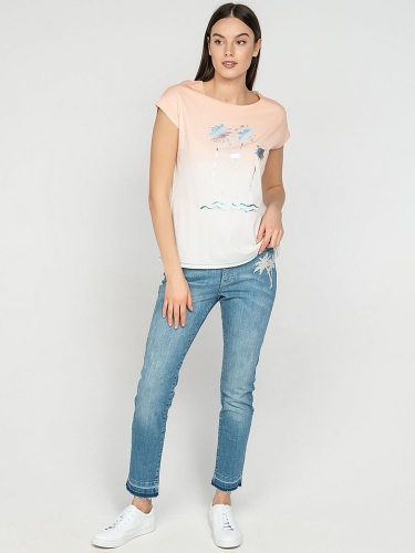 Футболка слегка приталенного силуэта. Модный эффект градиента, металлизированный принт с тропическими мотивами. Короткие цельнокроеные рукава. Декоративная отстрочка по нижнему краю. Приятный к телу хлопковый материал.