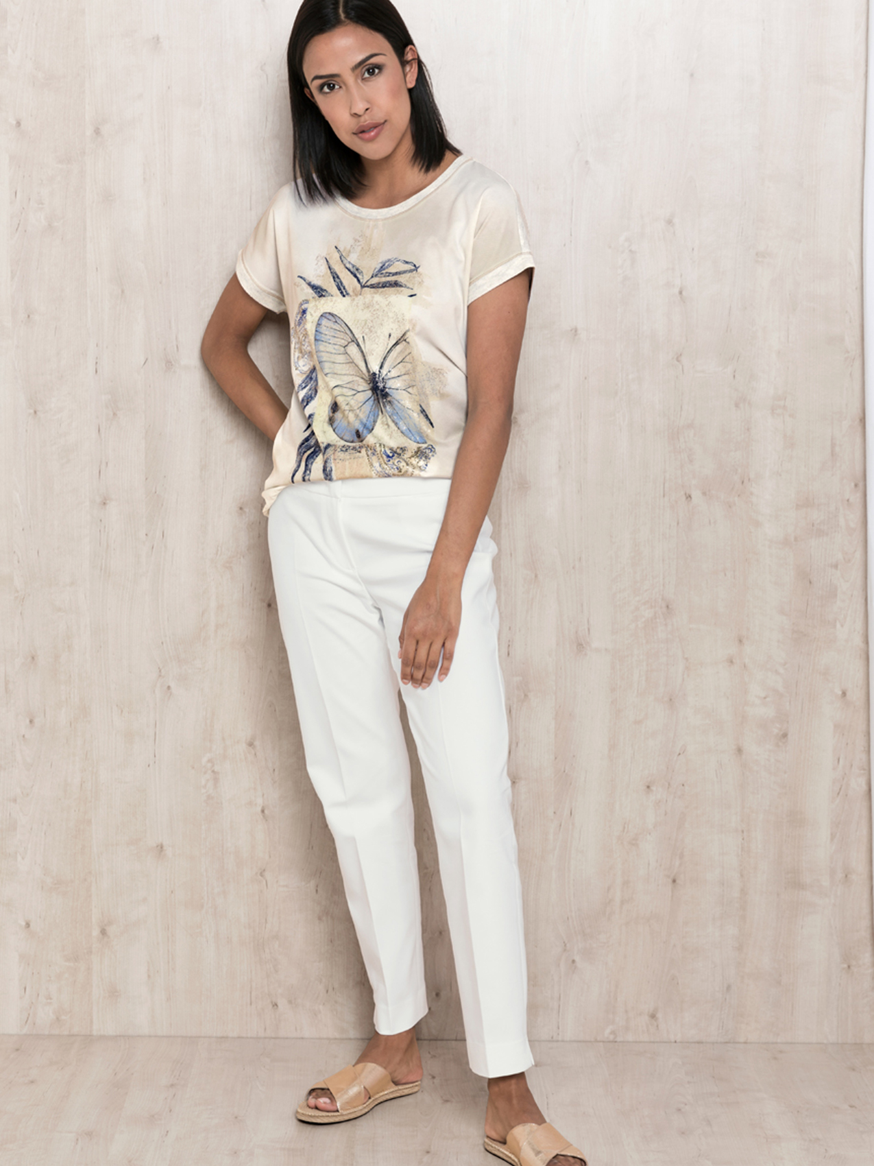 Футболка в нежном нюдовом оттенке с романтичным принтом спереди. Короткий цельнокроеный рукав с подворотом, круглый вырез горловины.